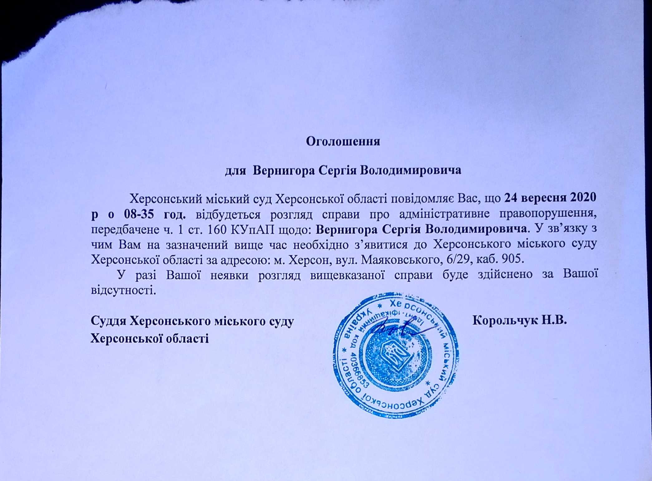 ОГОЛОШЕННЯ для Вернигори Сергія Володимировича