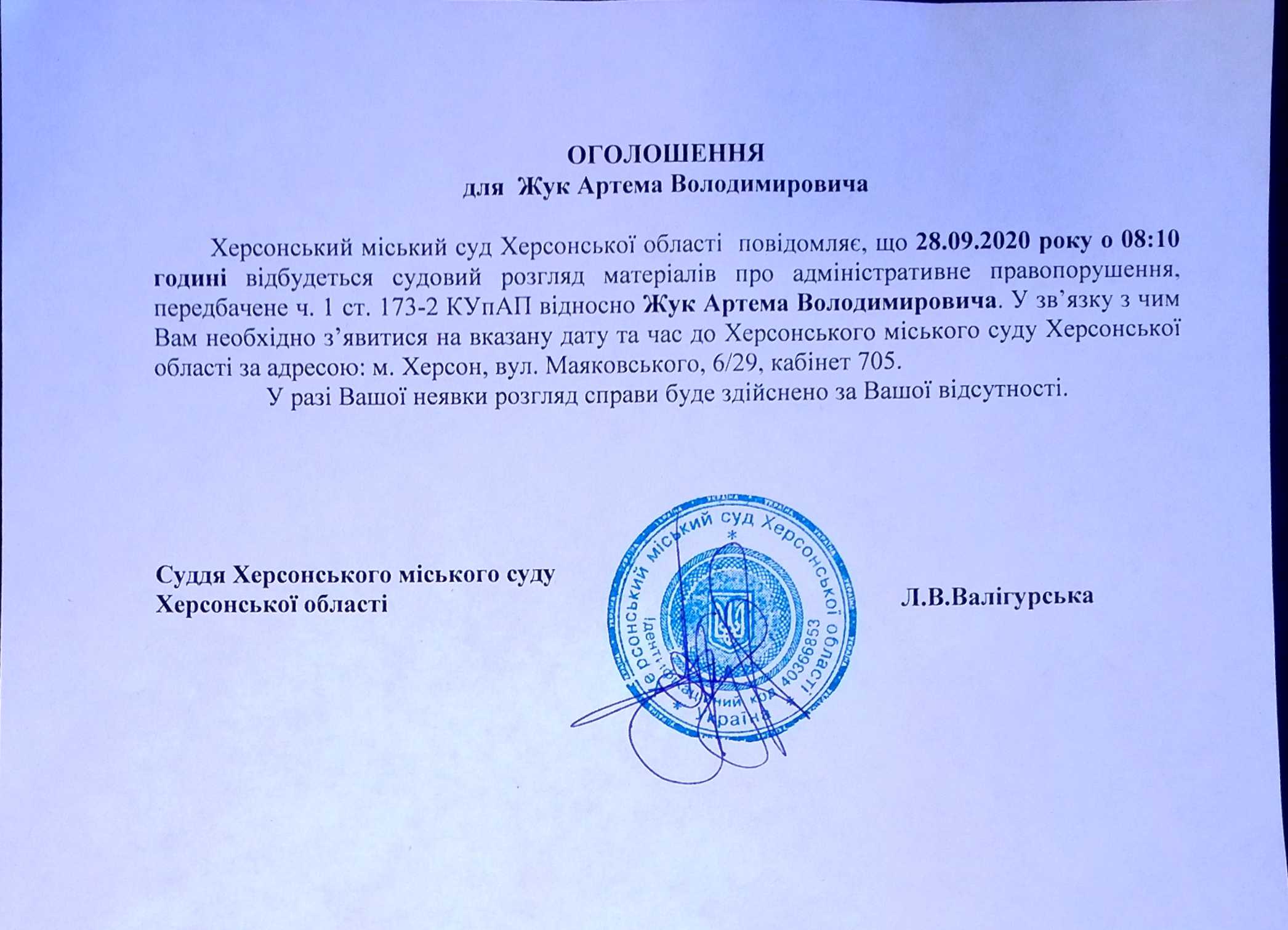 ОГОЛОШЕННЯ для Жук Артема Володимировича