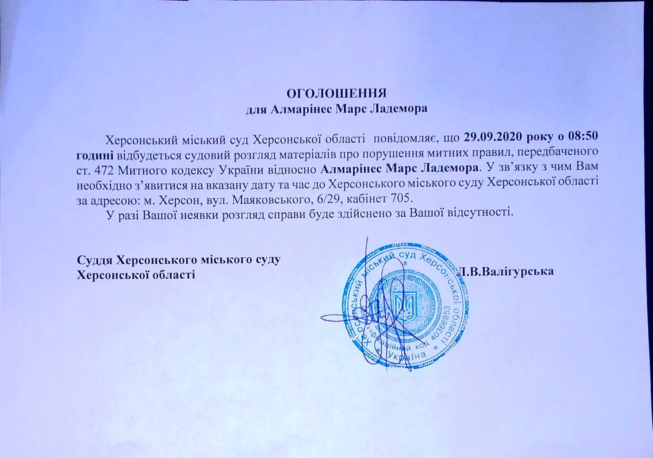 ОГОЛОШЕННЯ ПРО ВИКЛИК ДО СУДУ
