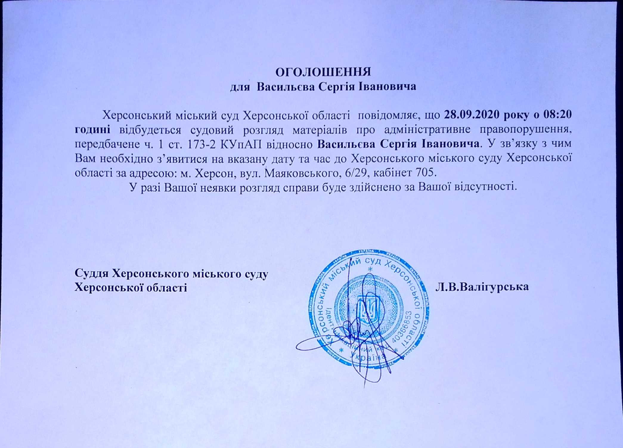 ОГОЛОШЕННЯ для Васильєва Сергія Івановича