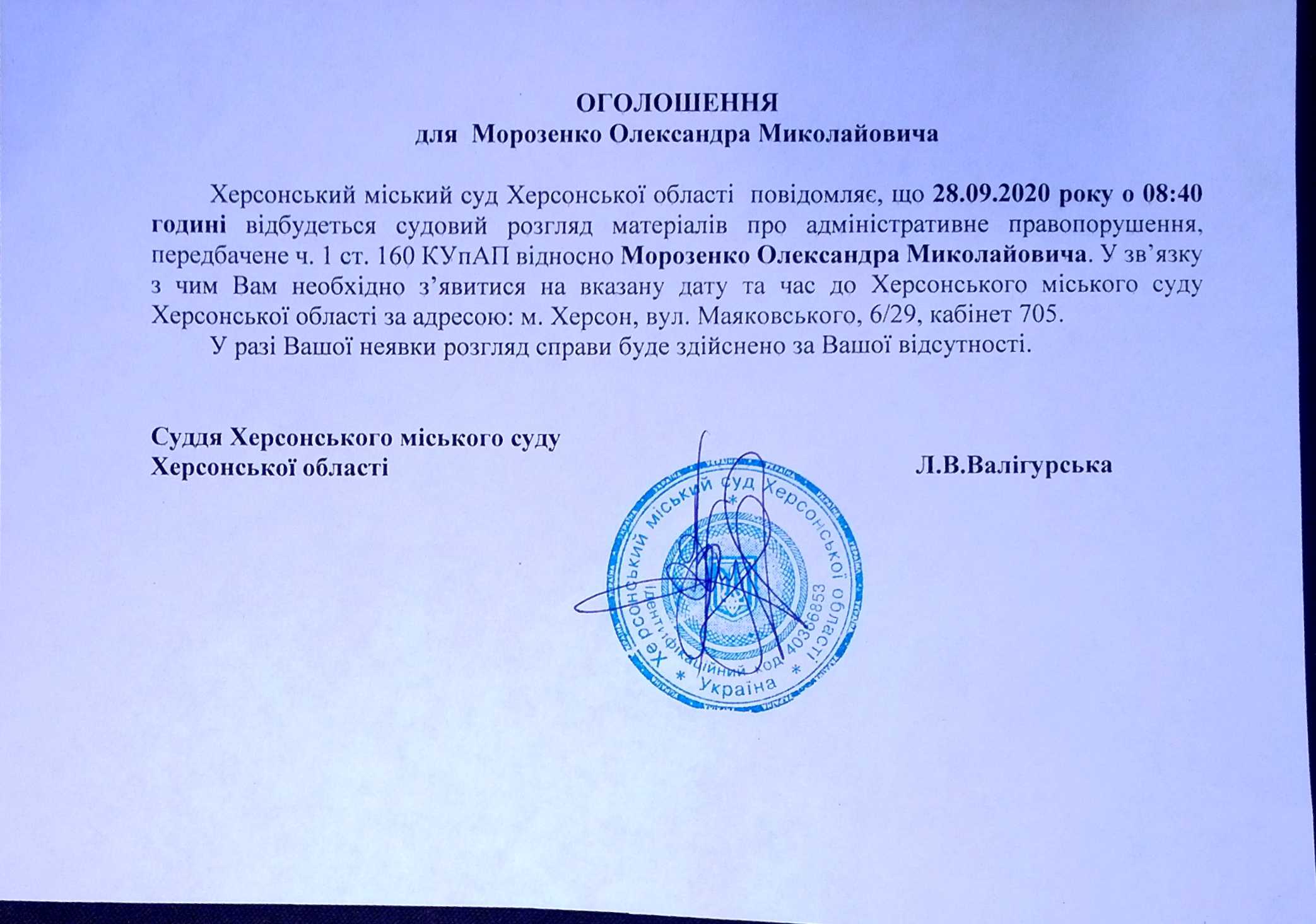 ОГОЛОШЕННЯ для Морозенко Олександра Миколайовича