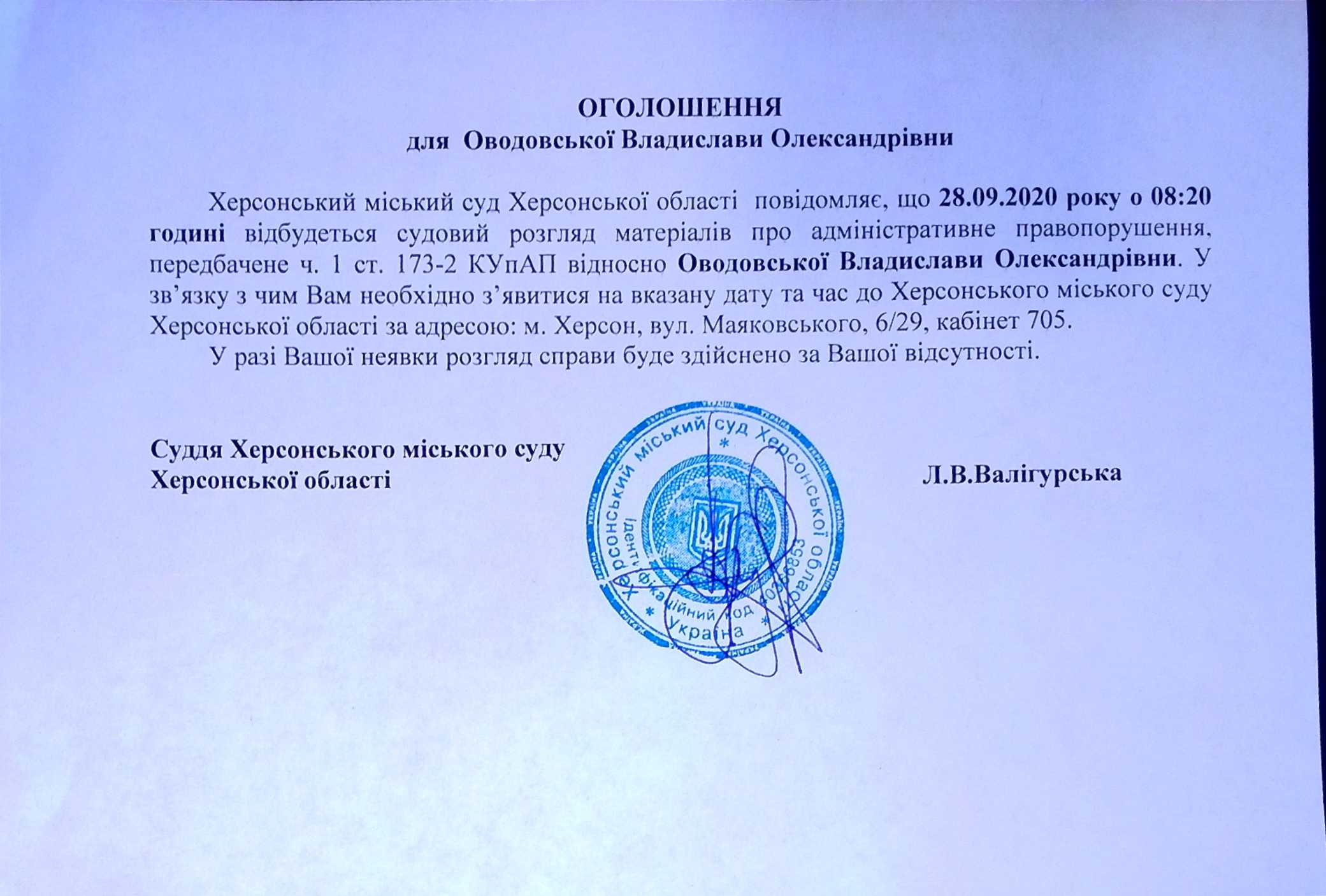 ОГОЛОШЕННЯ для Оводовської Владислави Олександрівни