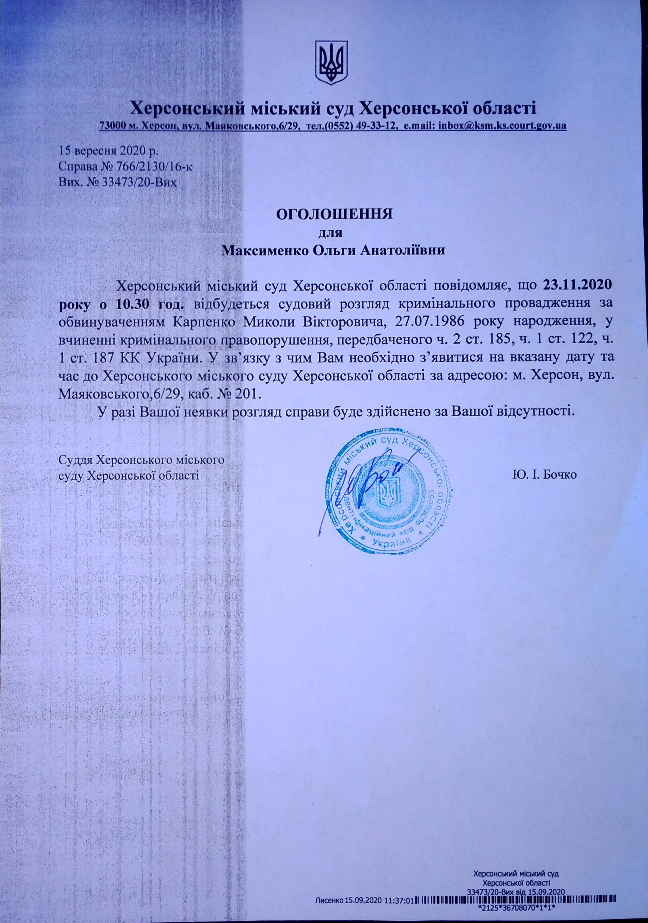 ОГОЛОШЕННЯ для Максименко Ольги Анатоліївни
