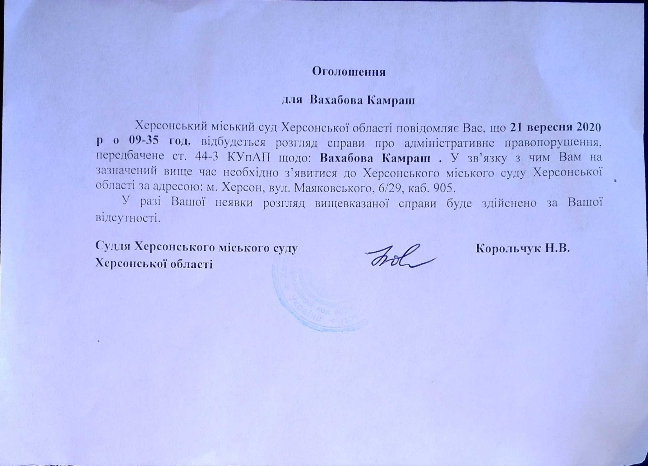 ОГОЛОШЕННЯ для Вахабова Камраш