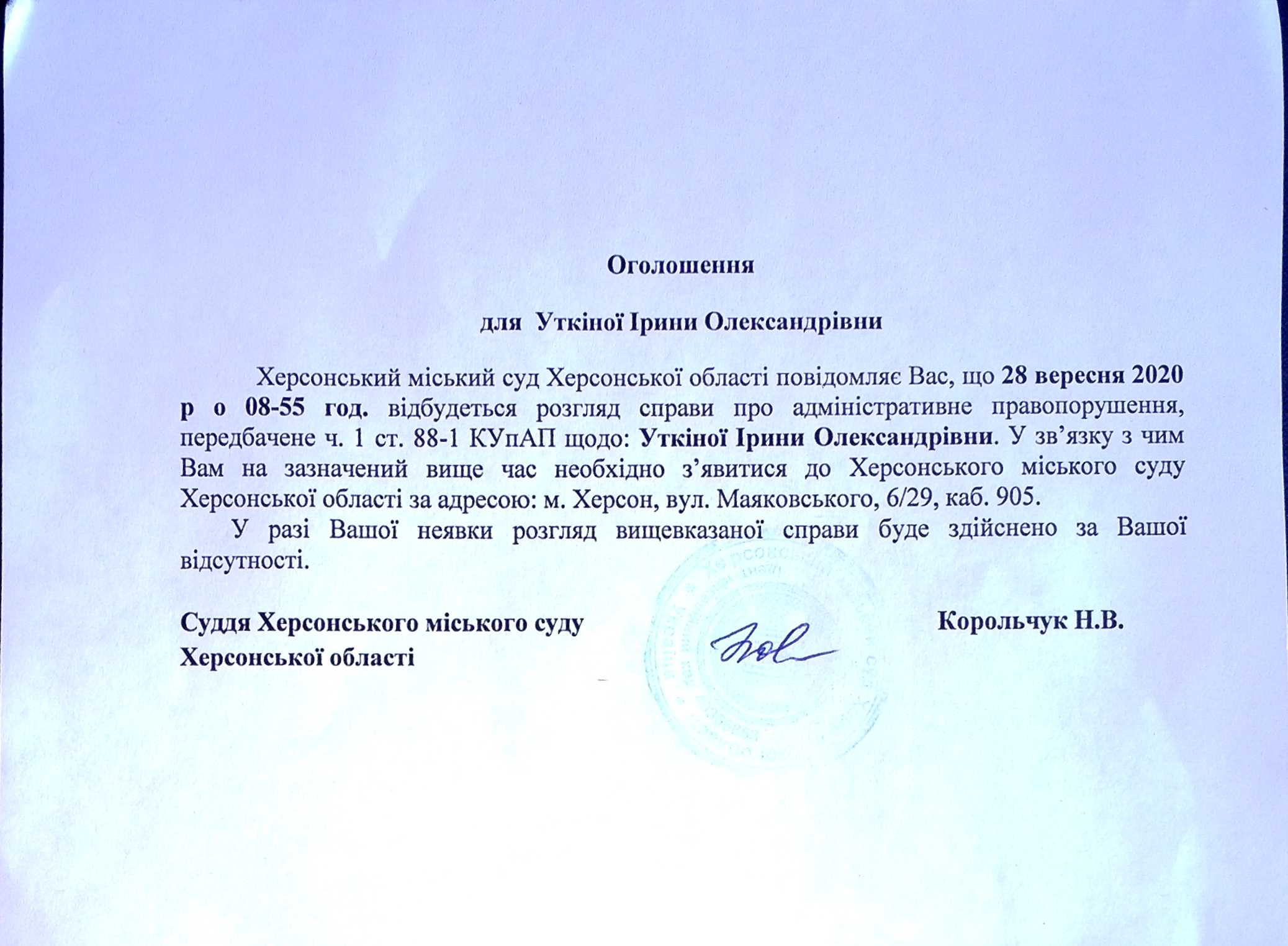 ОГОЛОШЕННЯ для Уткіної Ірини Олександрівни