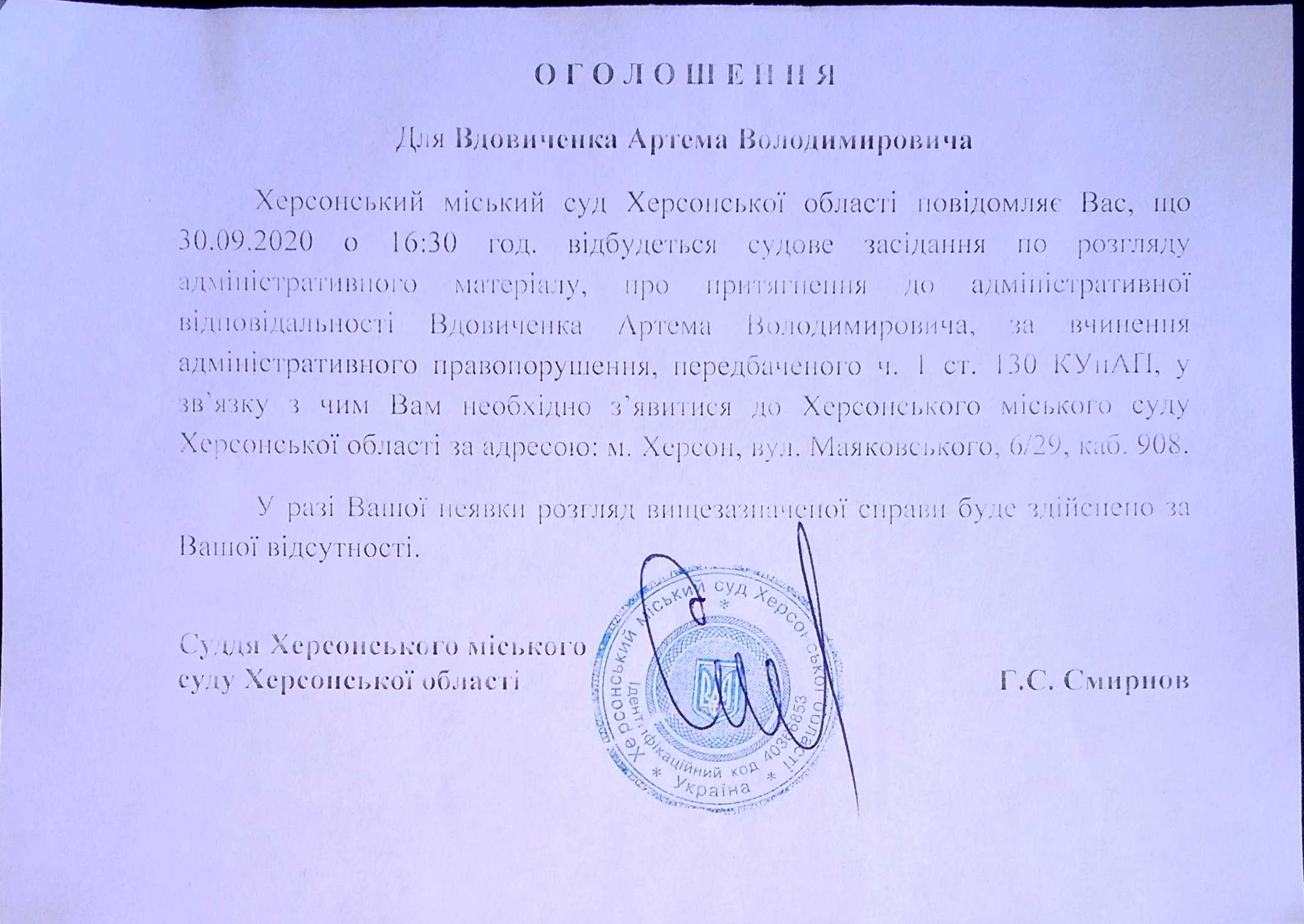 ОГОЛОШЕННЯ для Вдовиченка Артема Володимировича