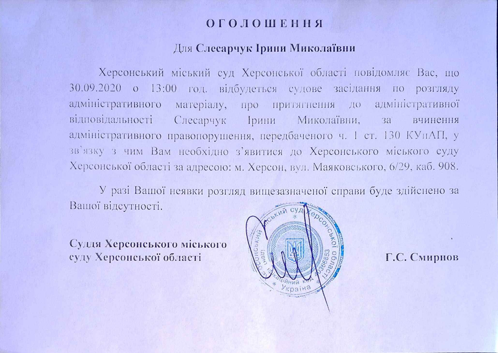 ОГОЛОШЕННЯ ПРО ВИКЛИК ДО СУДУ