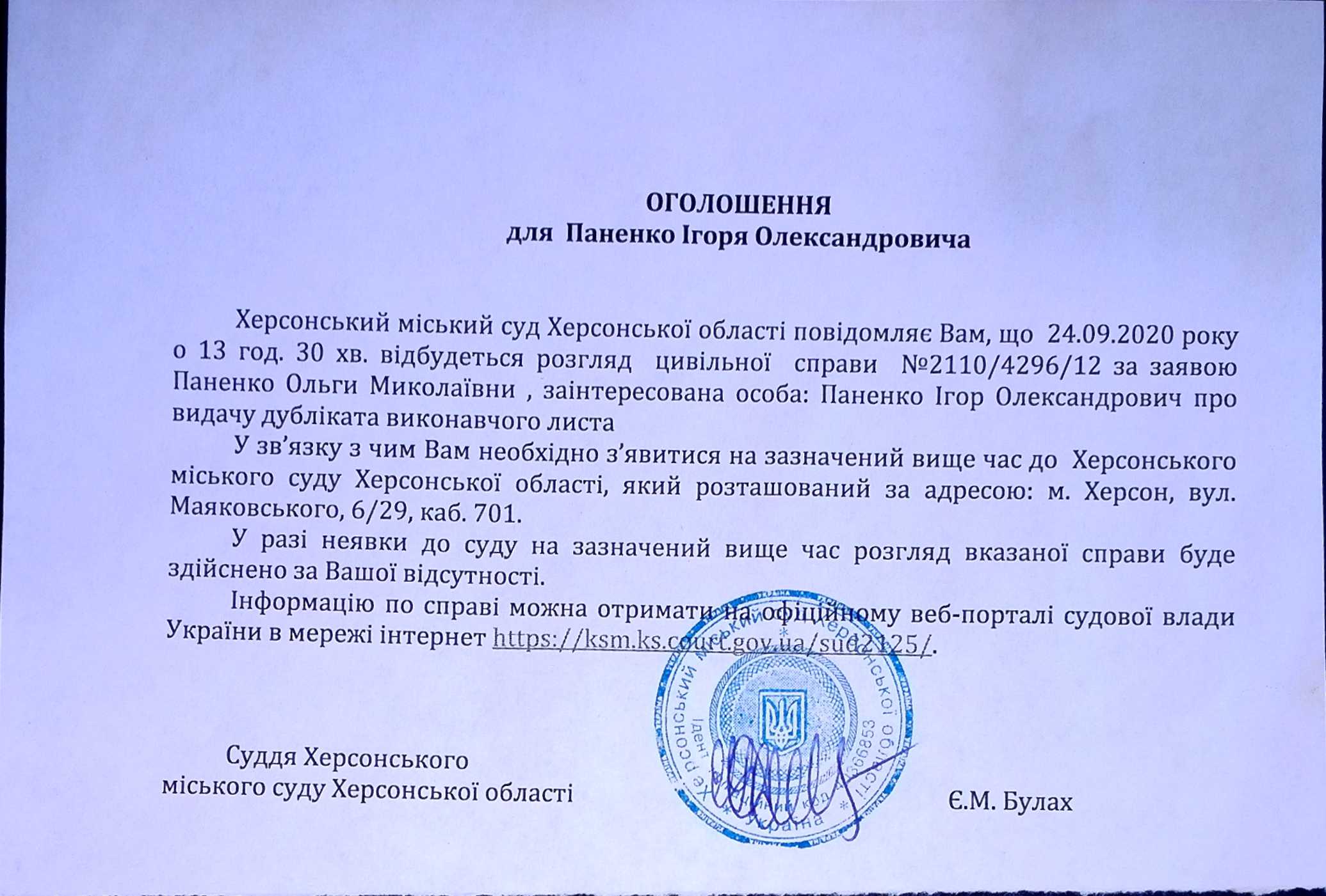 ОГОЛОШЕННЯ для Паненко Ігоря Олександровича