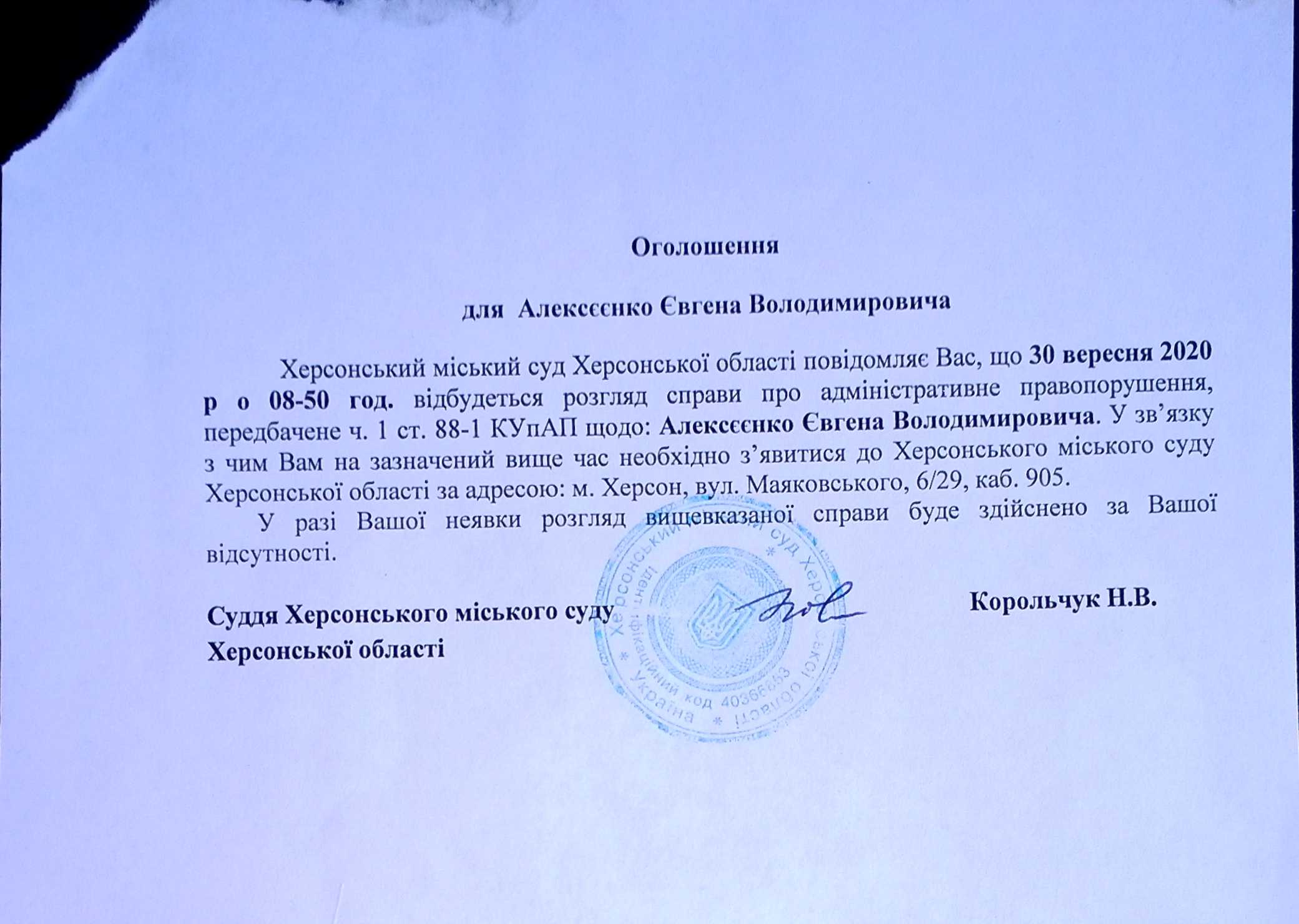 ОГОЛОШЕННЯ ПРО ВИКЛИК ДО СУДУ