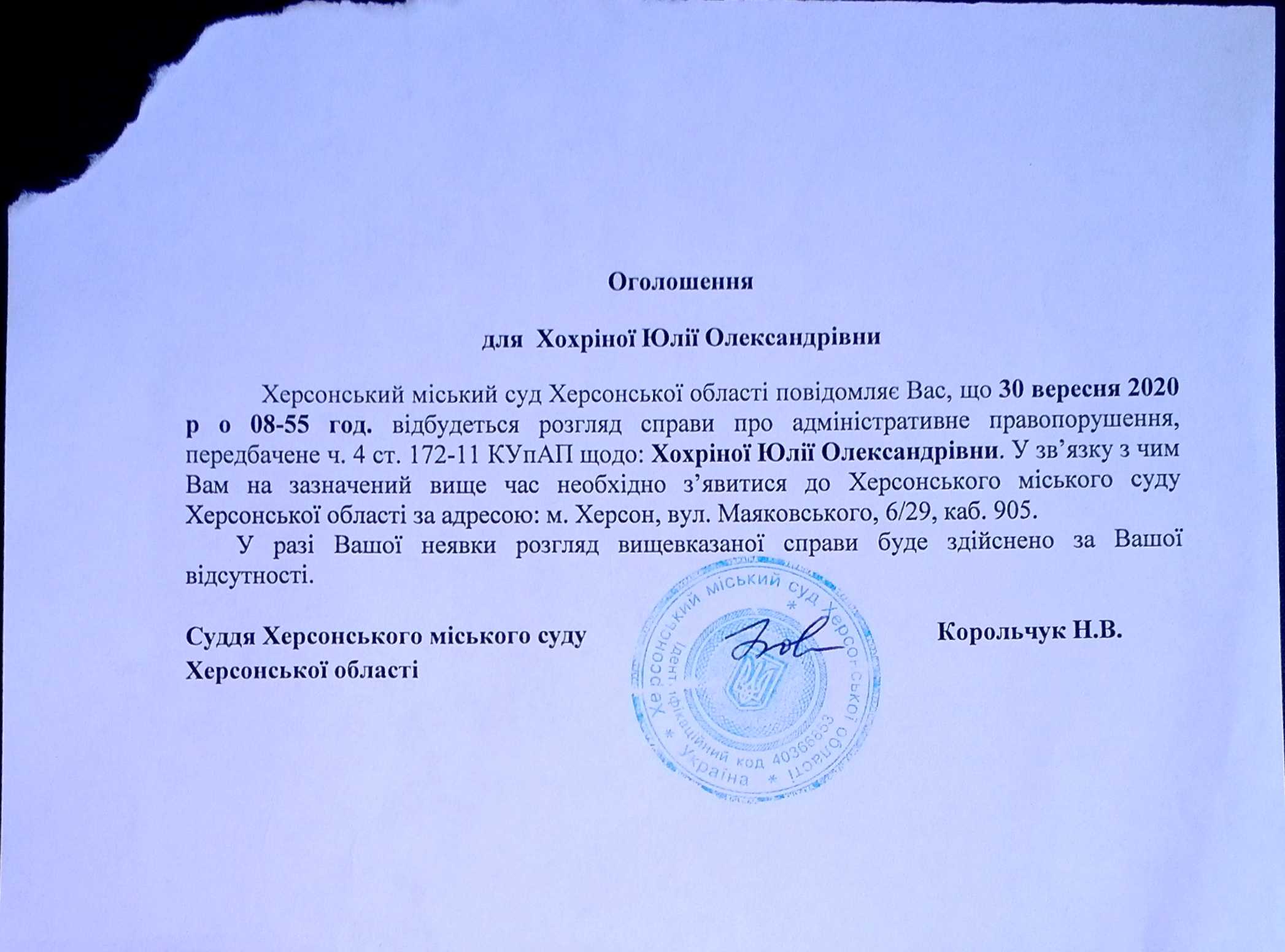ОГОЛОШЕННЯ для Хохріної Юлії Олександрівни