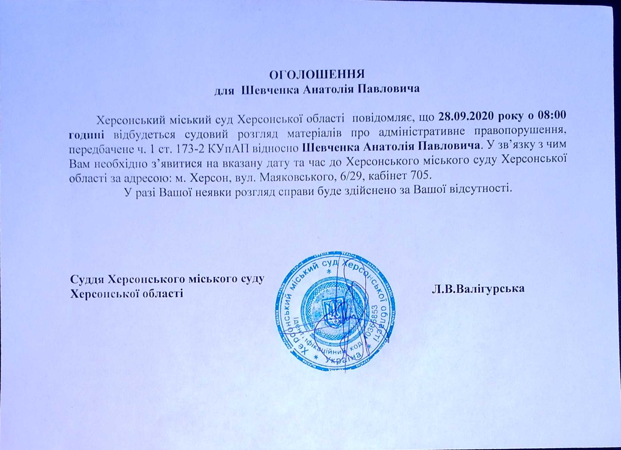 ОГОЛОШЕННЯ для Шевченка Анатолія Павловича