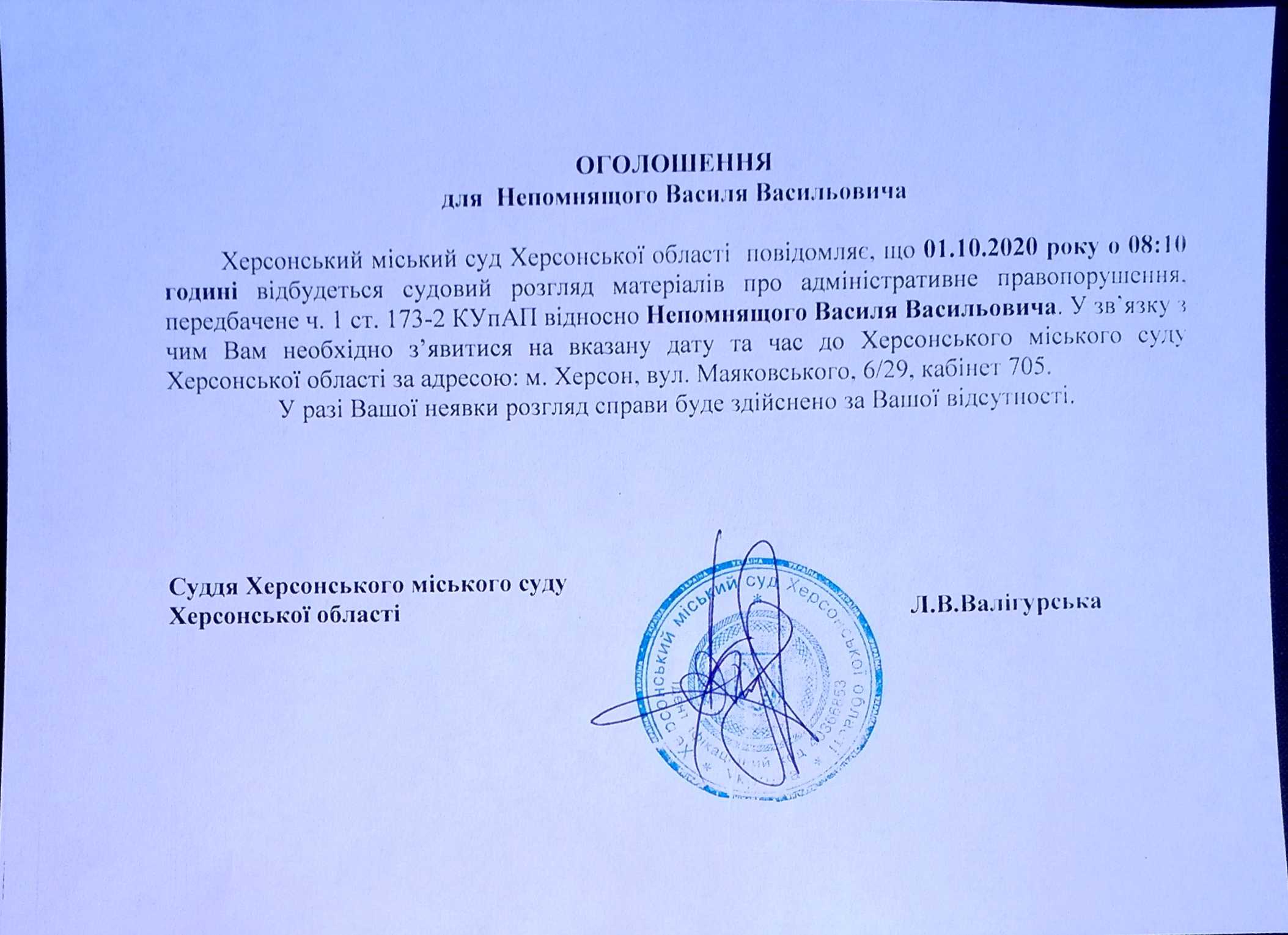 ОГОЛОШЕННЯ ПРО ВИКЛИК ДО СУДУ