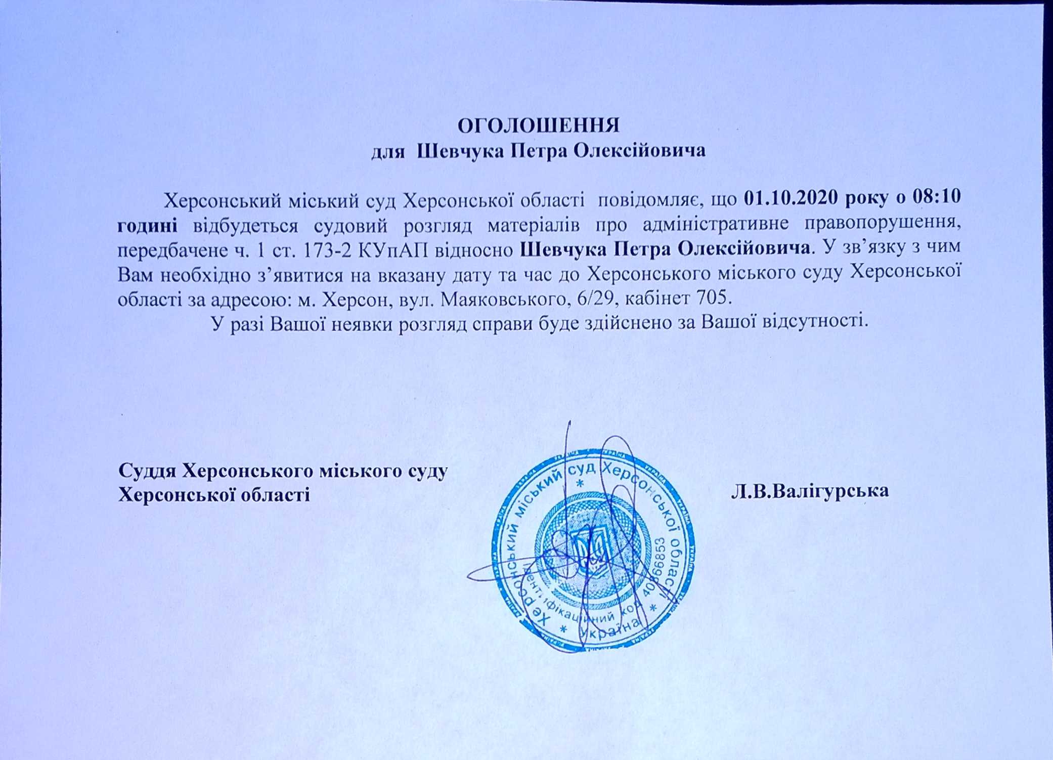 ОГОЛОШЕННЯ ПРО ВИКЛИК ДО СУДУ