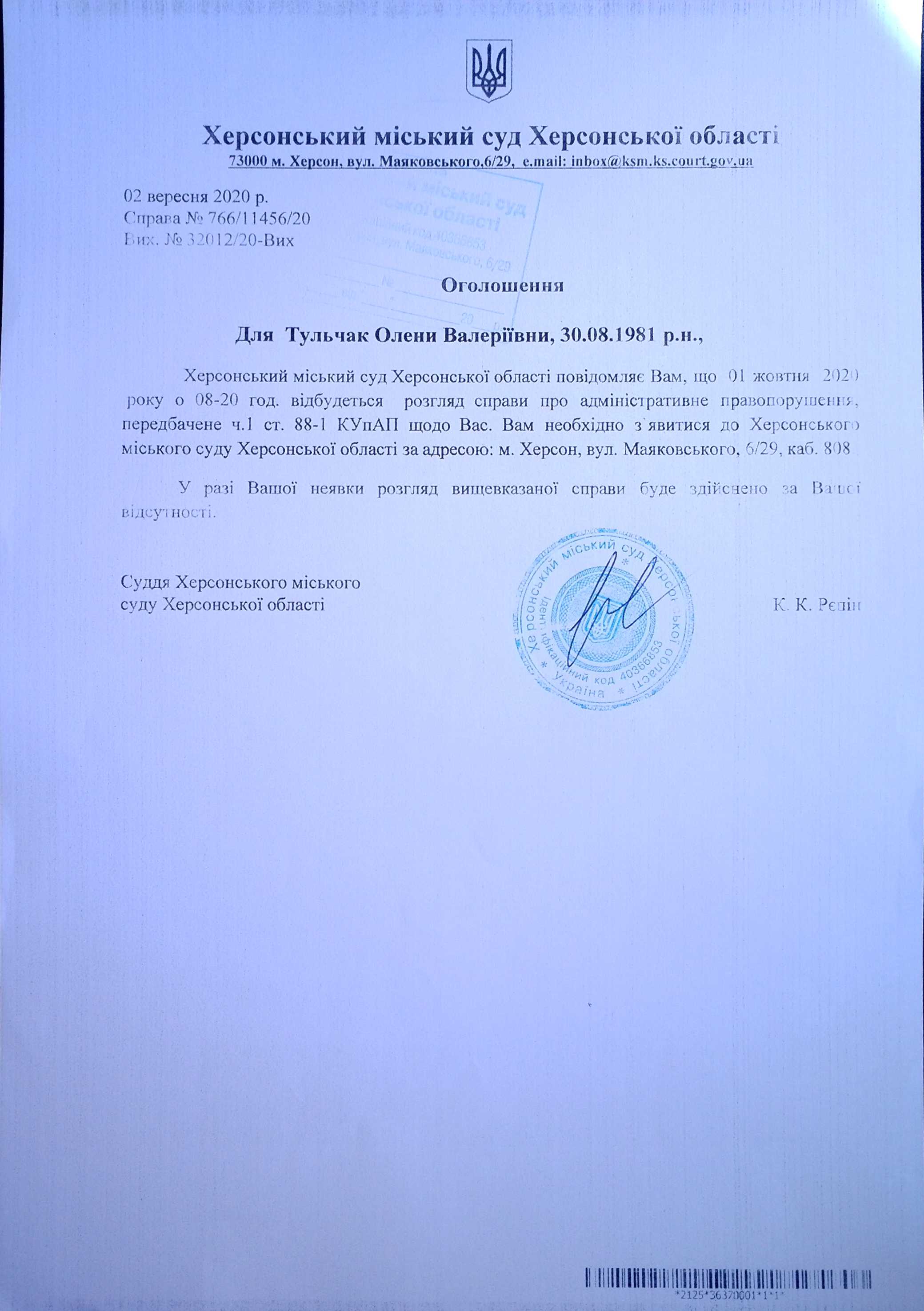 ОГОЛОШЕННЯ для Тульчак Олени Валеріївни