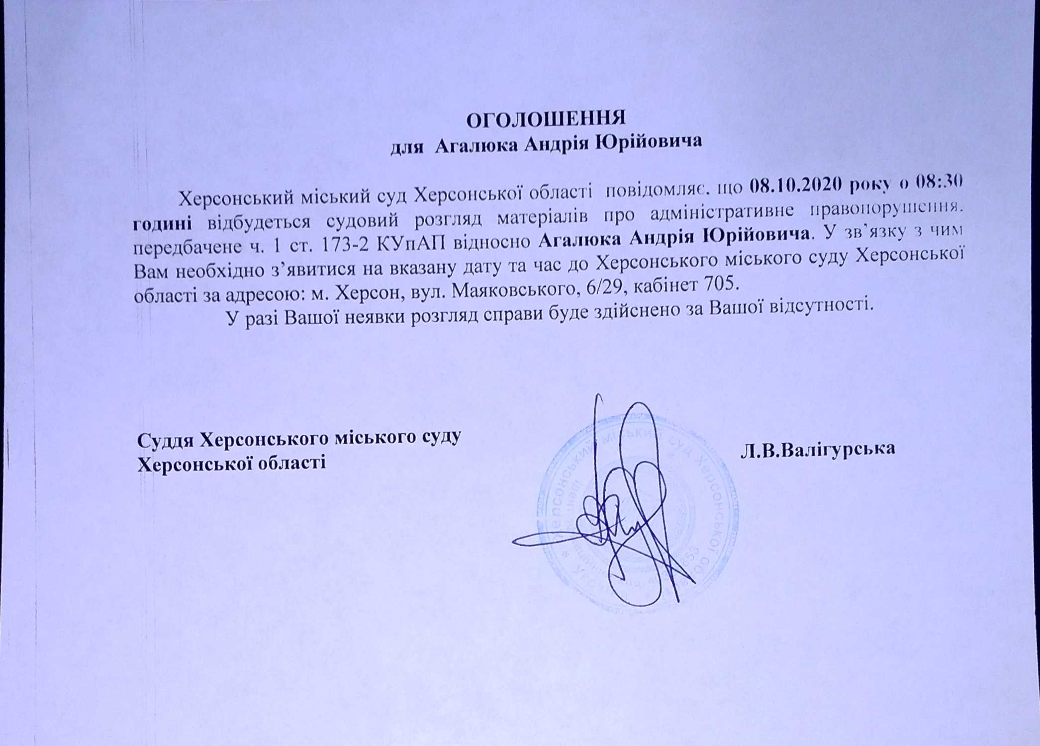 ОГОЛОШЕННЯ для Агалюка Андрія Юрійовича