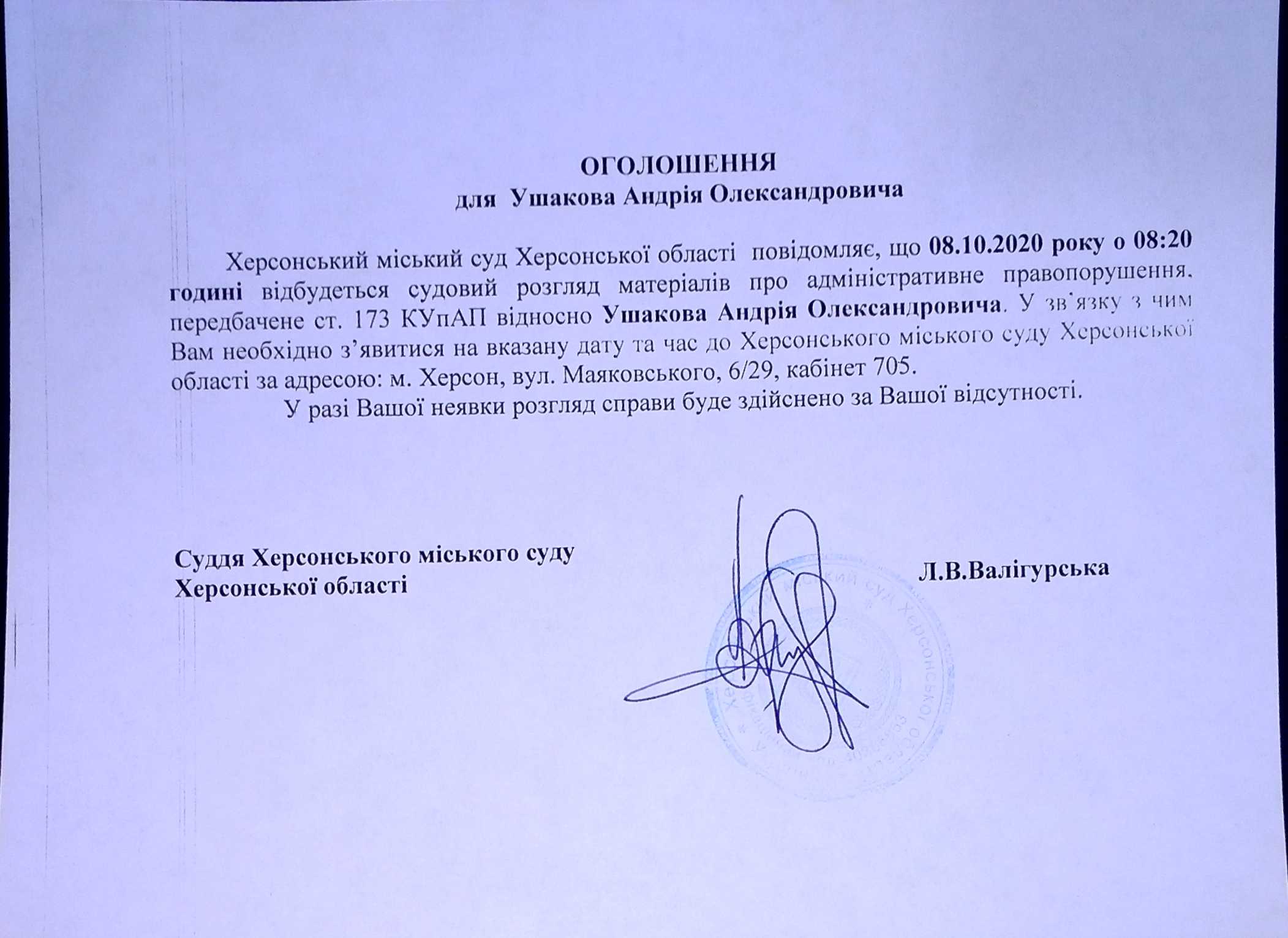 ОГОЛОШЕННЯ для Ушакова Андрія Олександровича