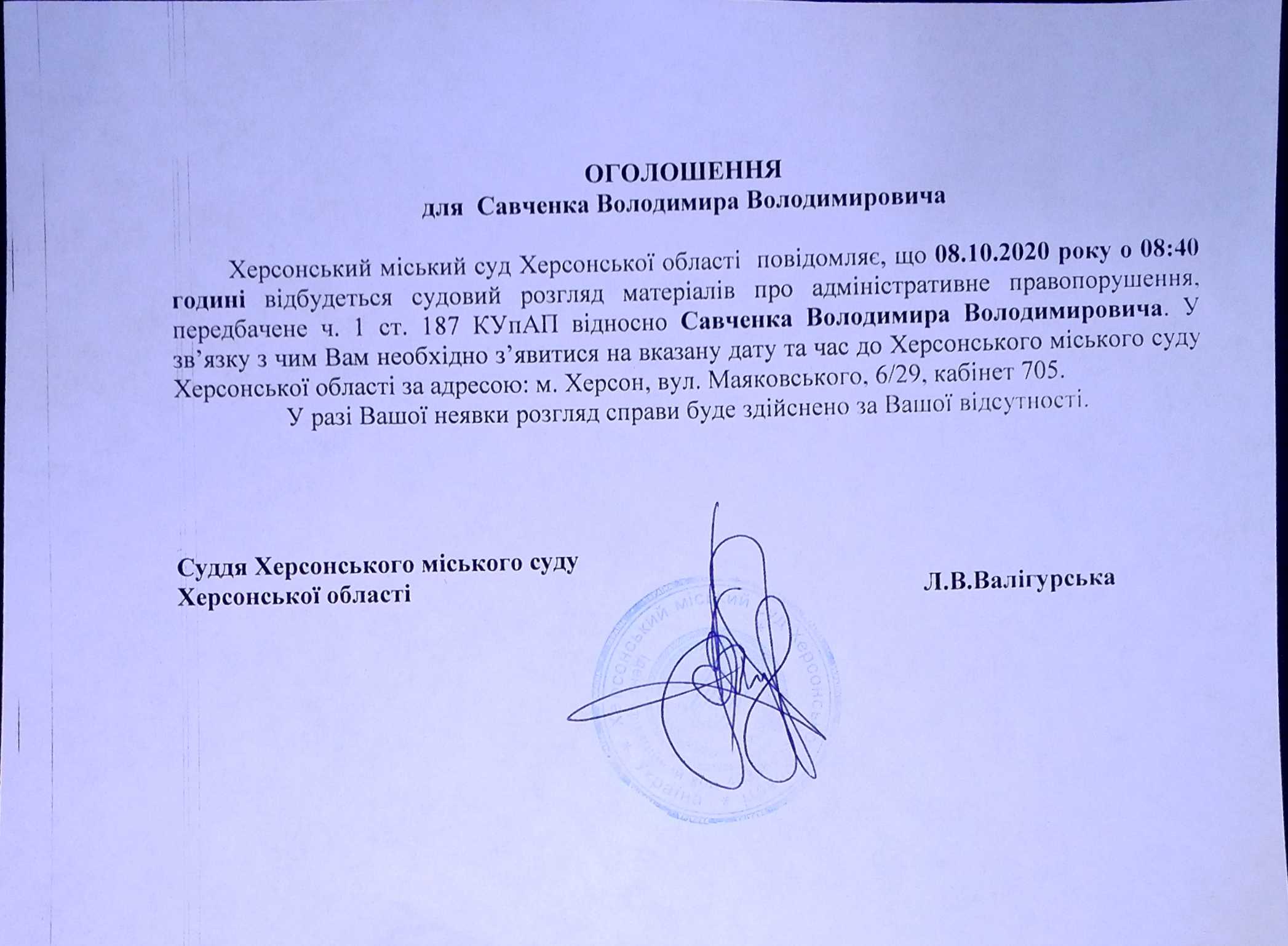 ОГОЛОШЕННЯ ПРО ВИКЛИК ДО СУДУ