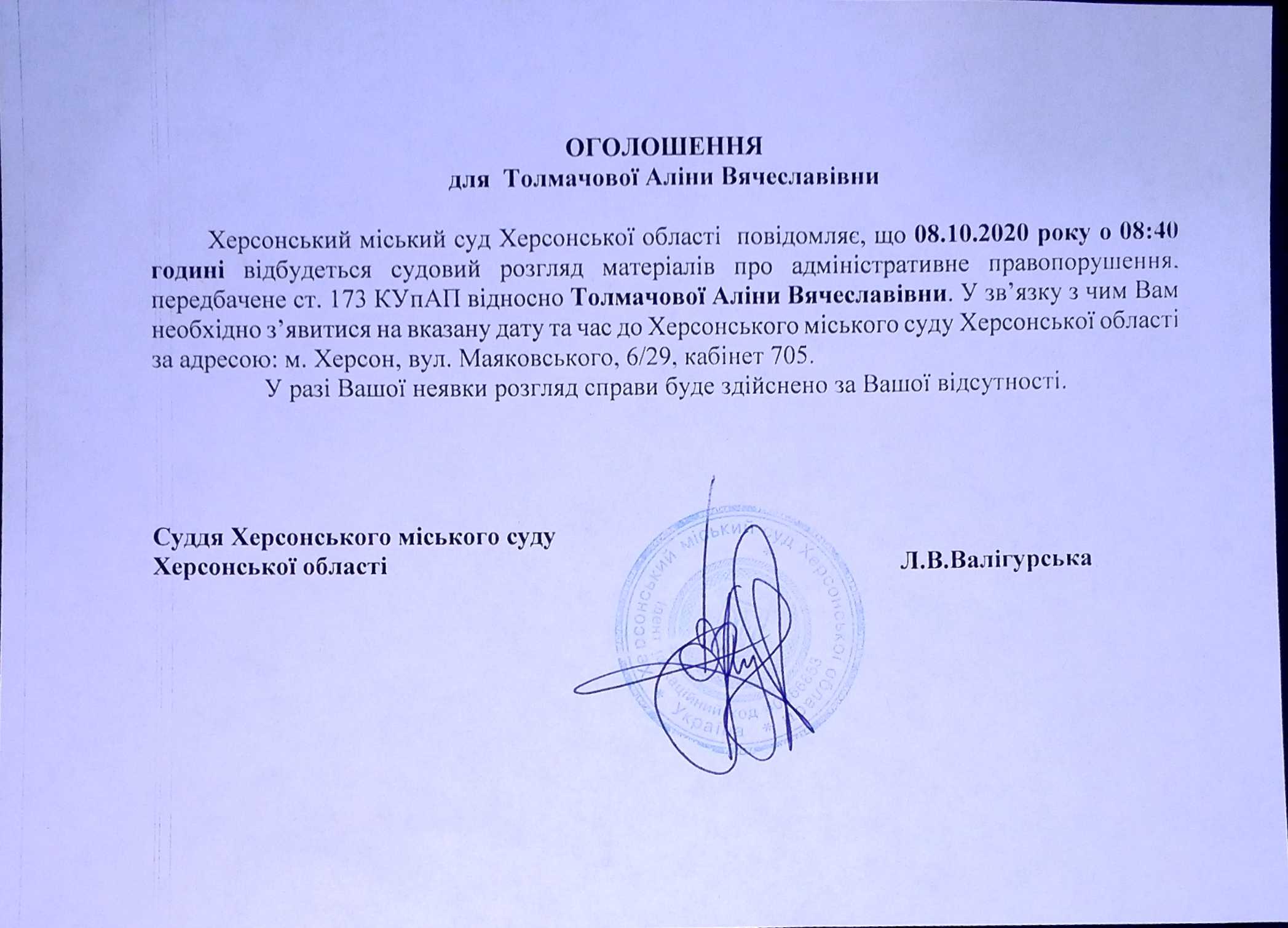 ОГОЛОШЕННЯ для Толмачової Аліни Вячеславівни
