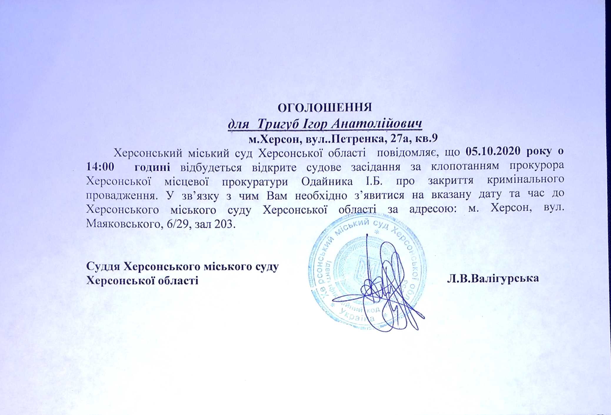 ОГОЛОШЕННЯ для Тригуб Ігоря Анатолійовича