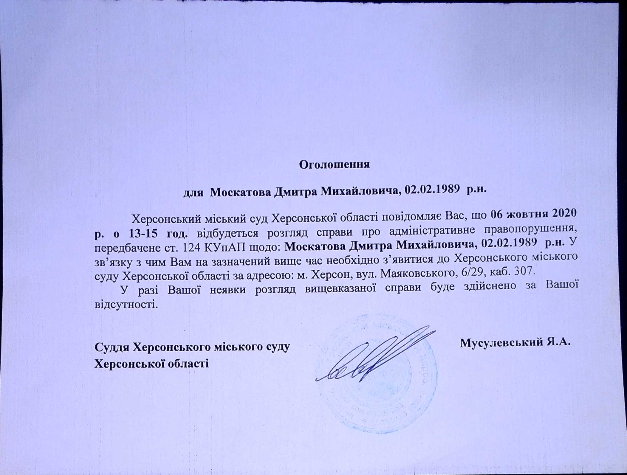 ОГОЛОШЕННЯ для Москатова Дмитра Михайловича