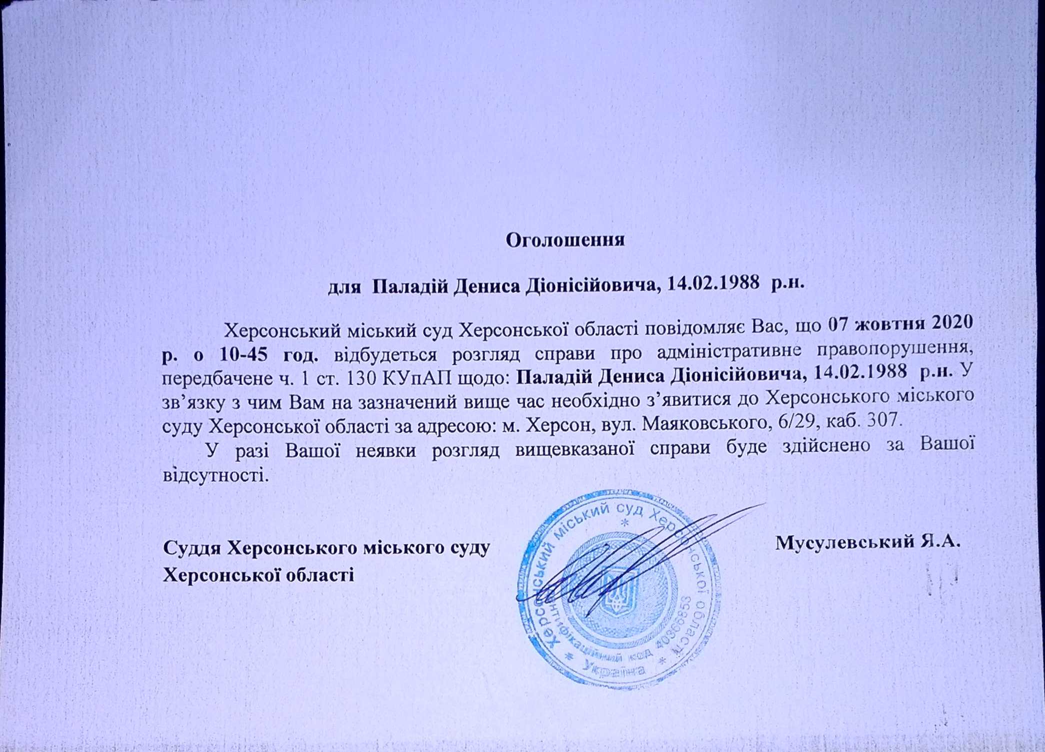 ОГОЛОШЕННЯ для Паладій Дениса Діонісійовича