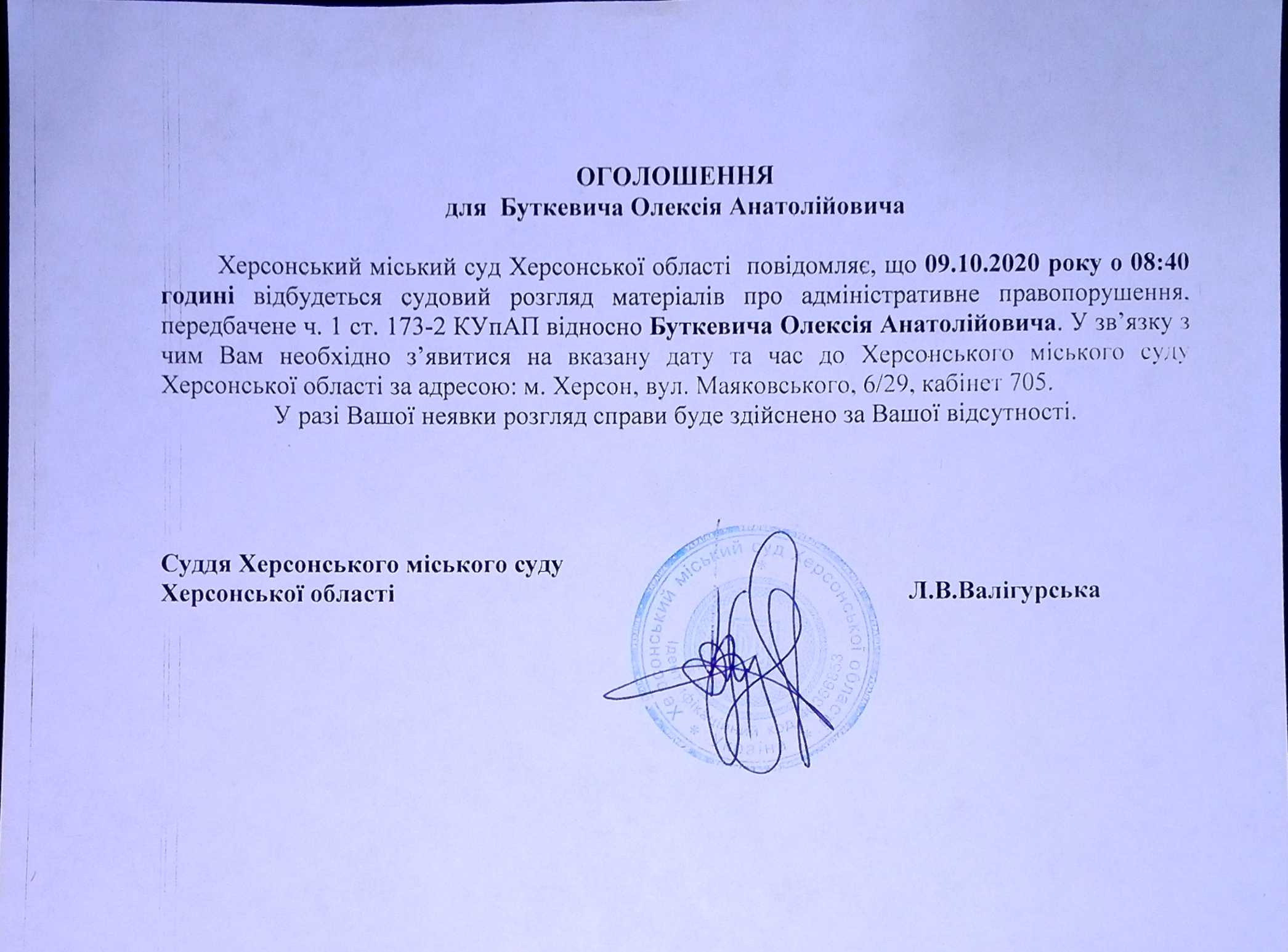 ОГОЛОШЕННЯ для Буткевича Олексія Анатолійовича