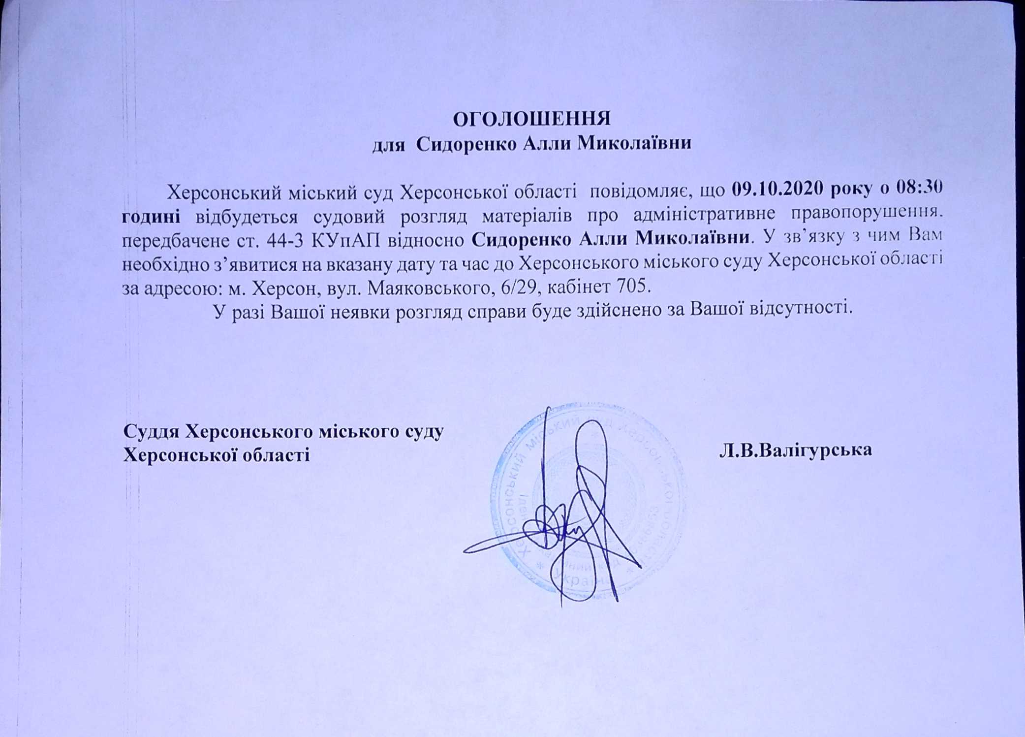 ОГОЛОШЕННЯ для Сидоренко Алли Миколаївни