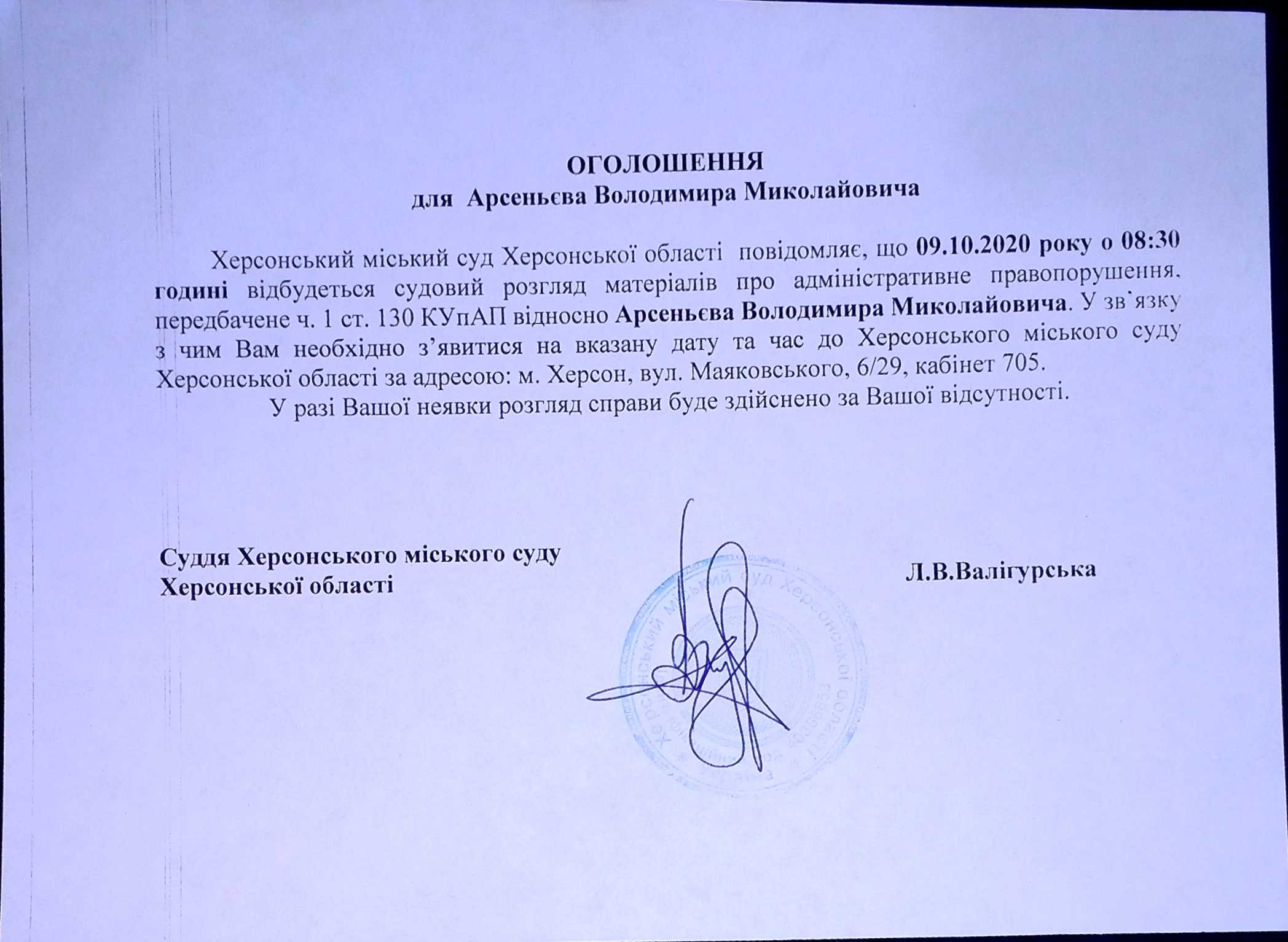 ОГОЛОШЕННЯ для Арсеньєва Володимира Миколайовича