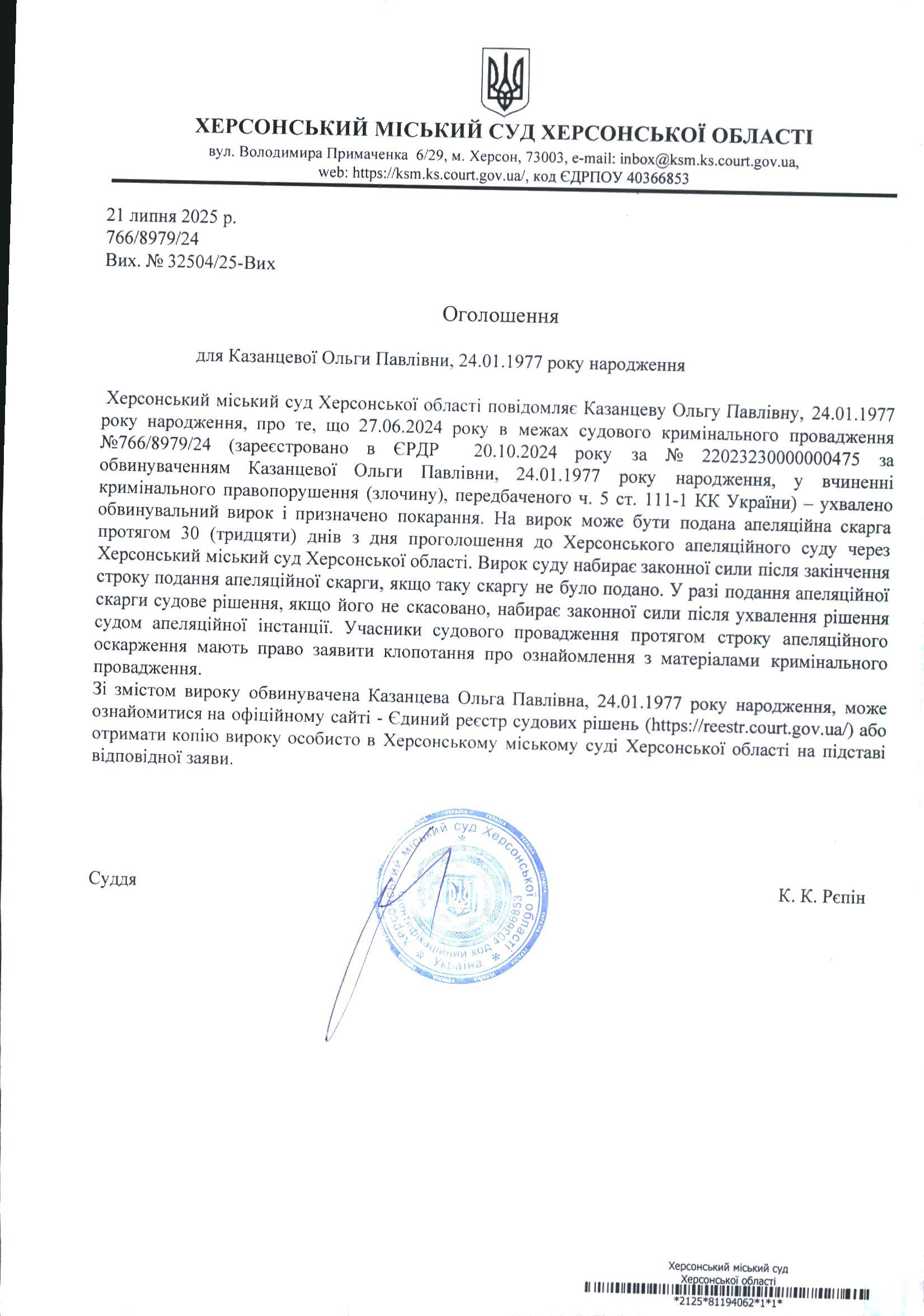 Оголошення для Казанцевої Ольги Павлівни про ухвалення вироку