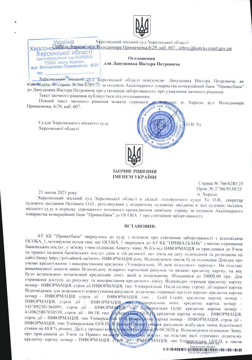 Оголошення для Лапушняка Віктора Петровича про ухвалення заочного рішення