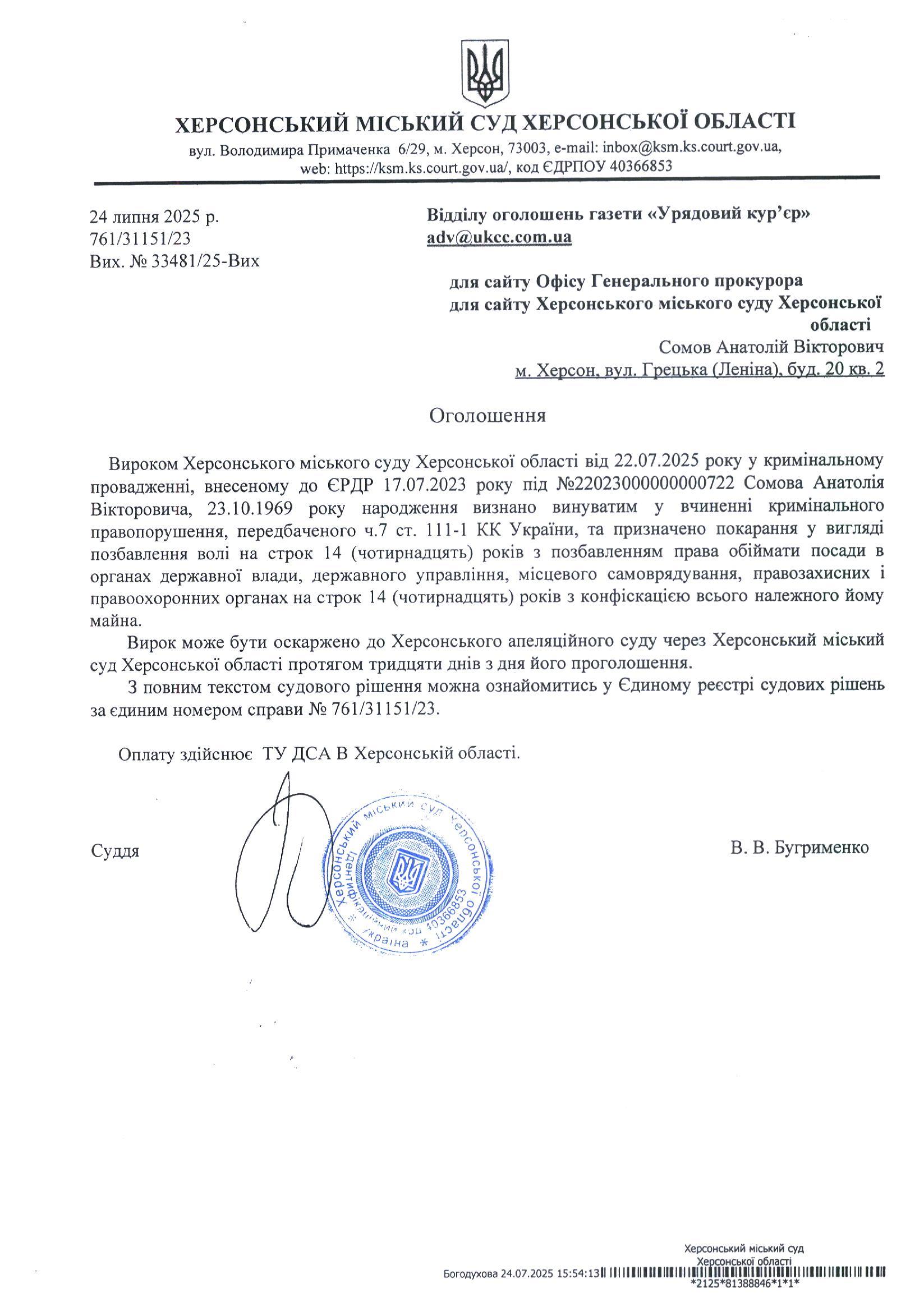 Оголошення для Сомова Анатолія Вікторовича про ухвалення вироку