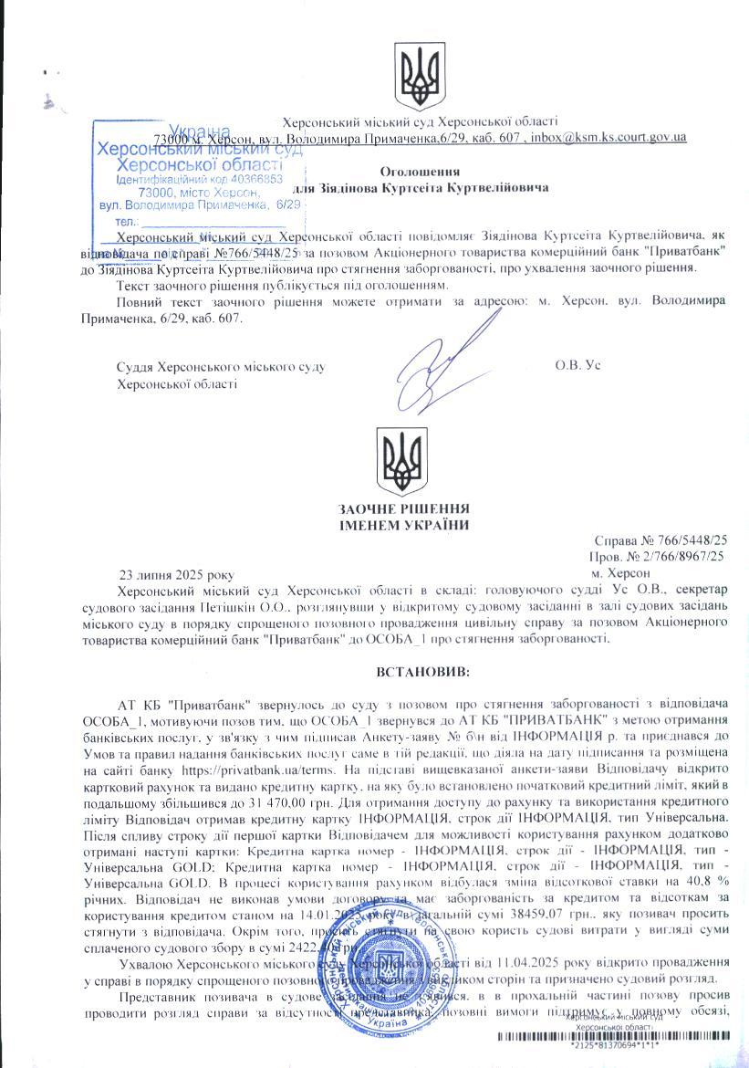 Оголошення для Зіядінова Куртсеіта Куртвелійовича про ухвалення заочного рішення