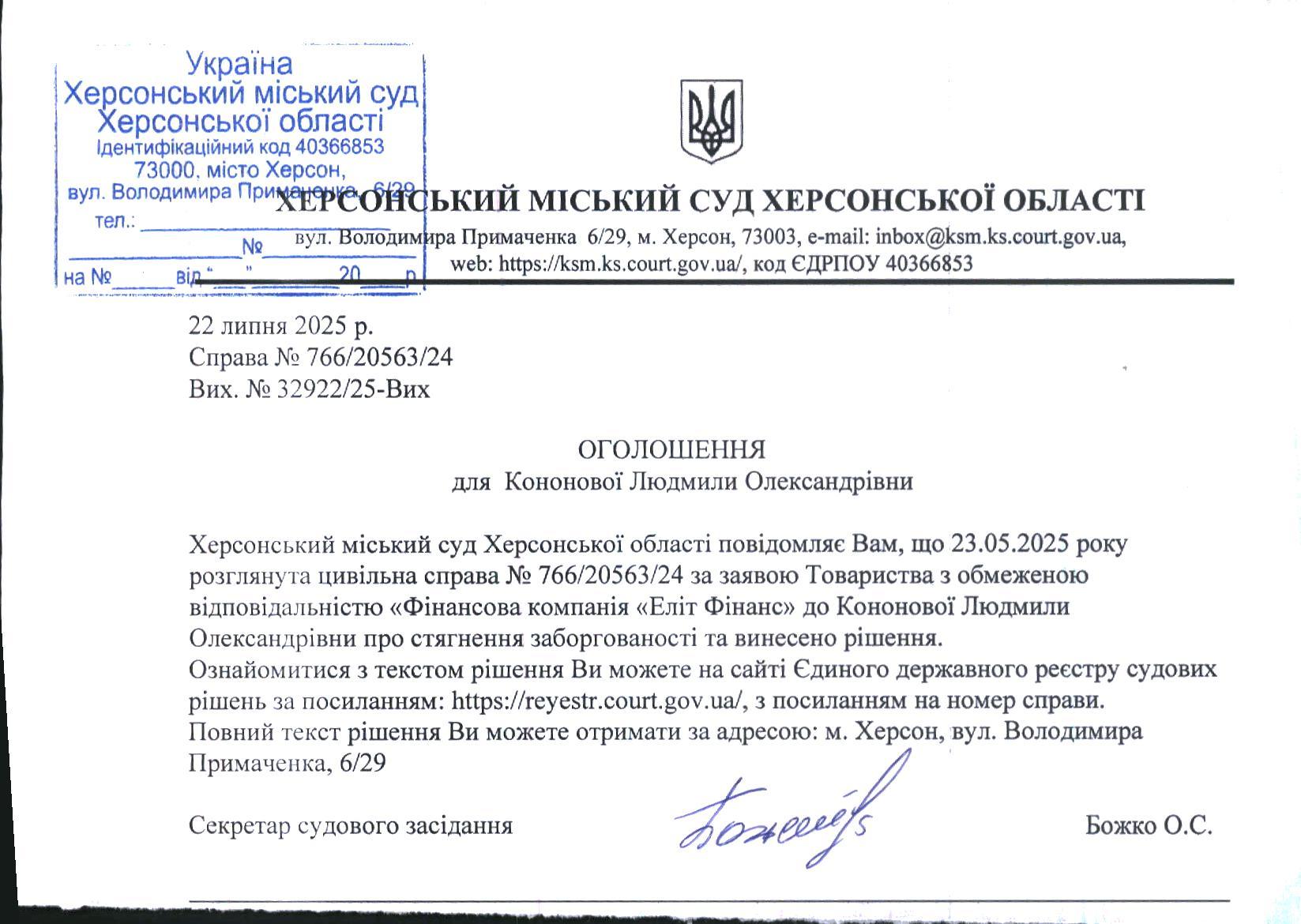Оголошення для Кононової Людмили Олександрівни про винесення рішення