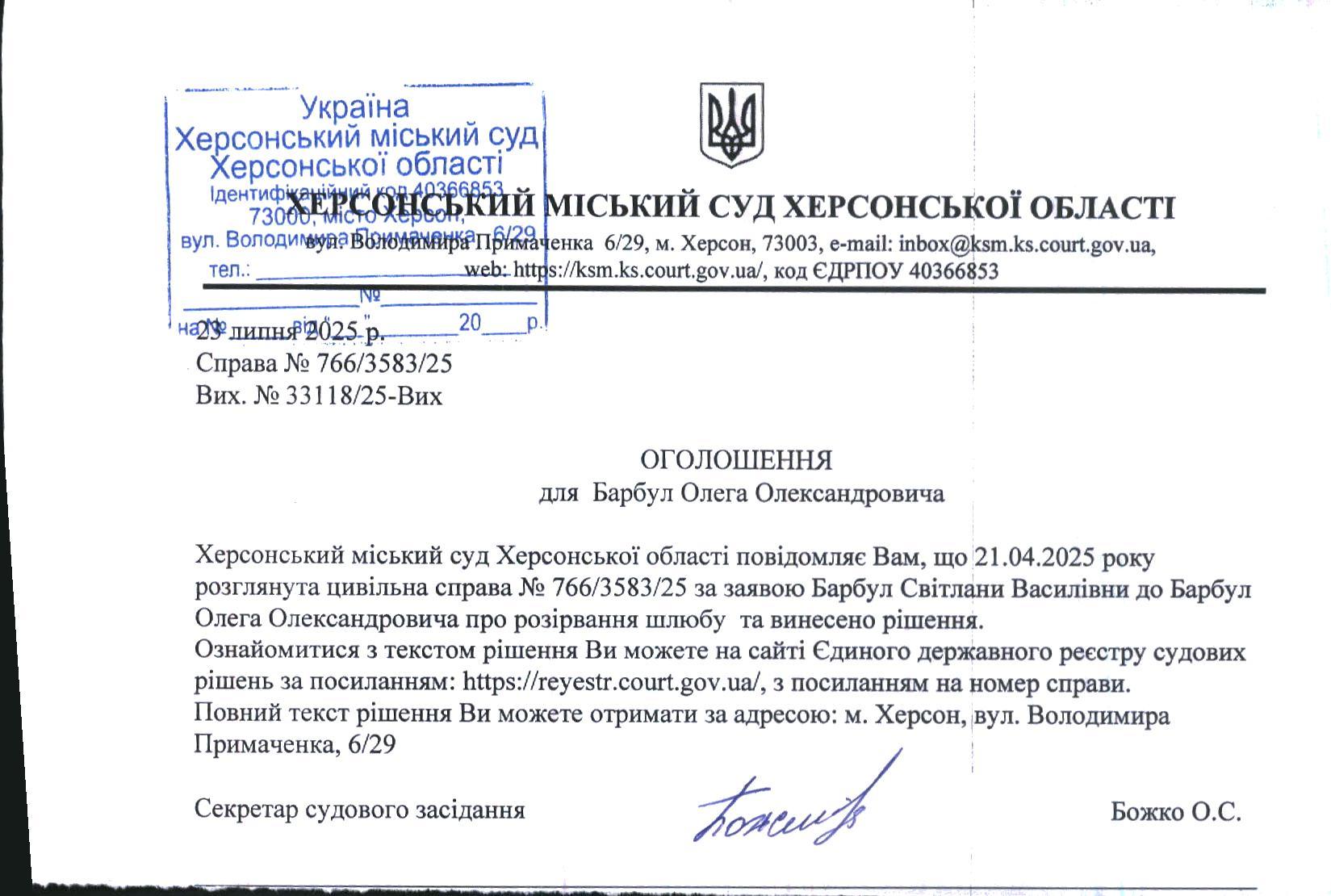 Оголошення для Барбул Олега Олександровича про винесення рішення