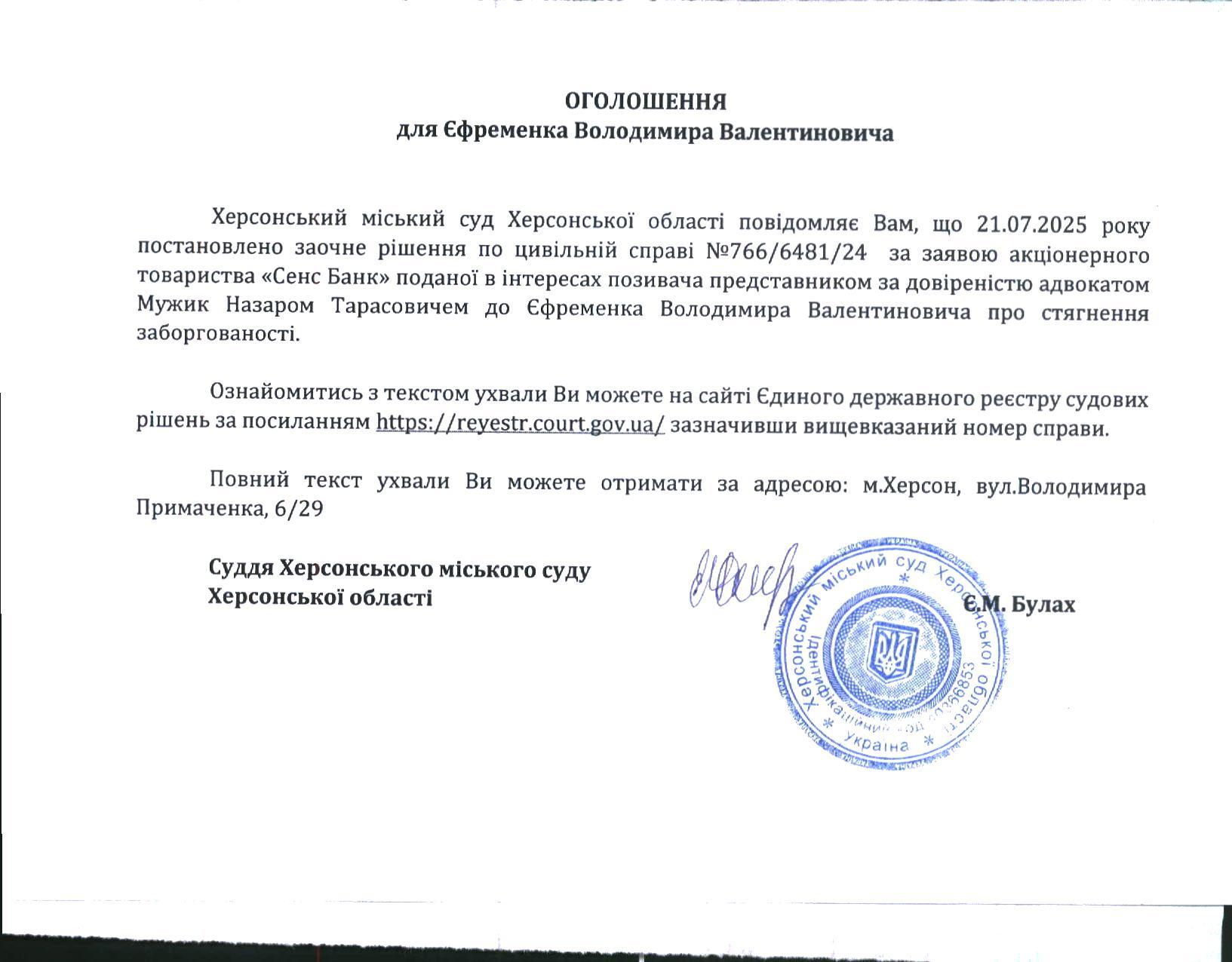 Оголошення для Єфременка Володимира Валентиновича про ухвалення заочного рішення