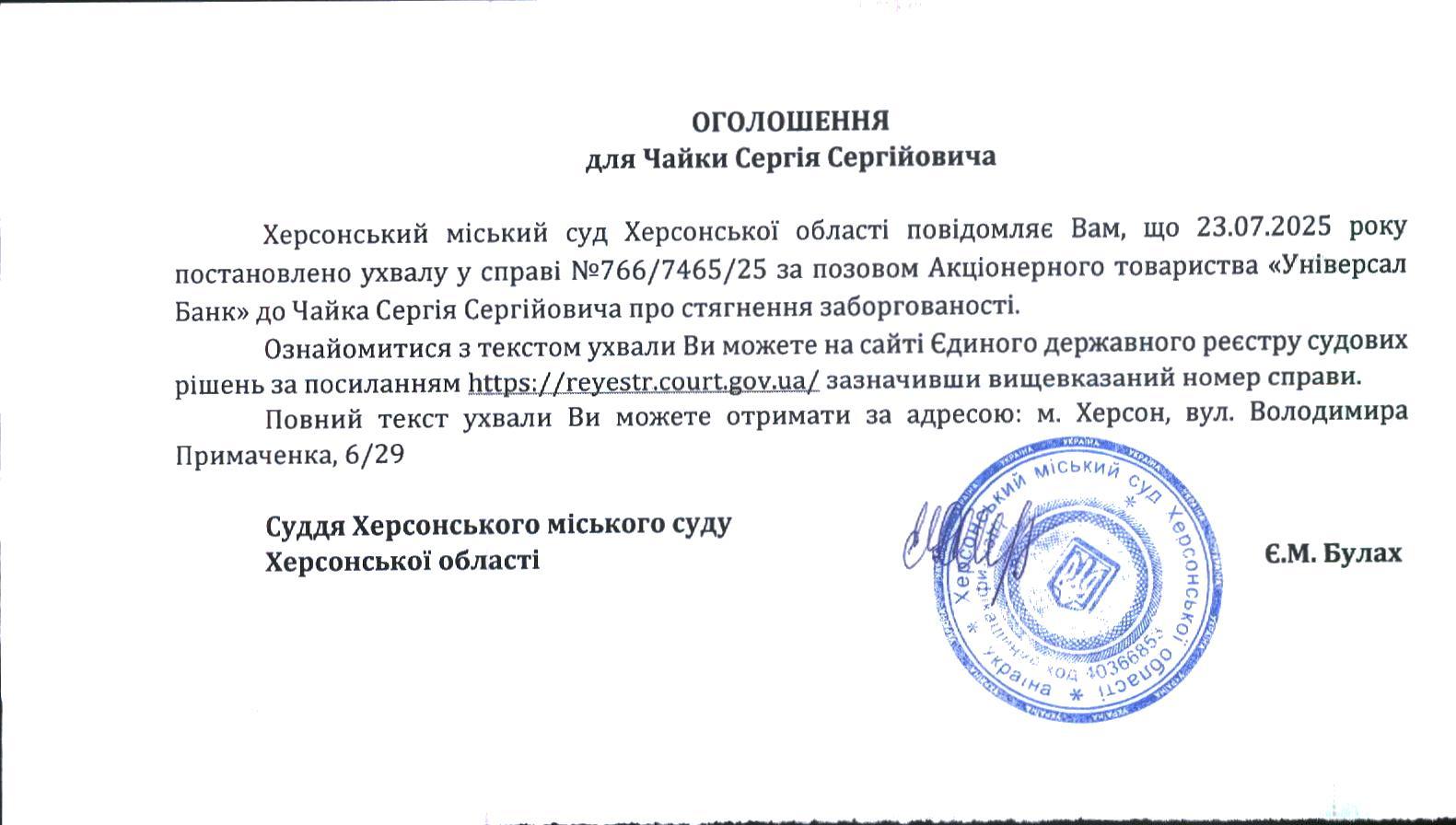 Оголошення для Чайки Сергія Сергійовича про постановлення ухвали