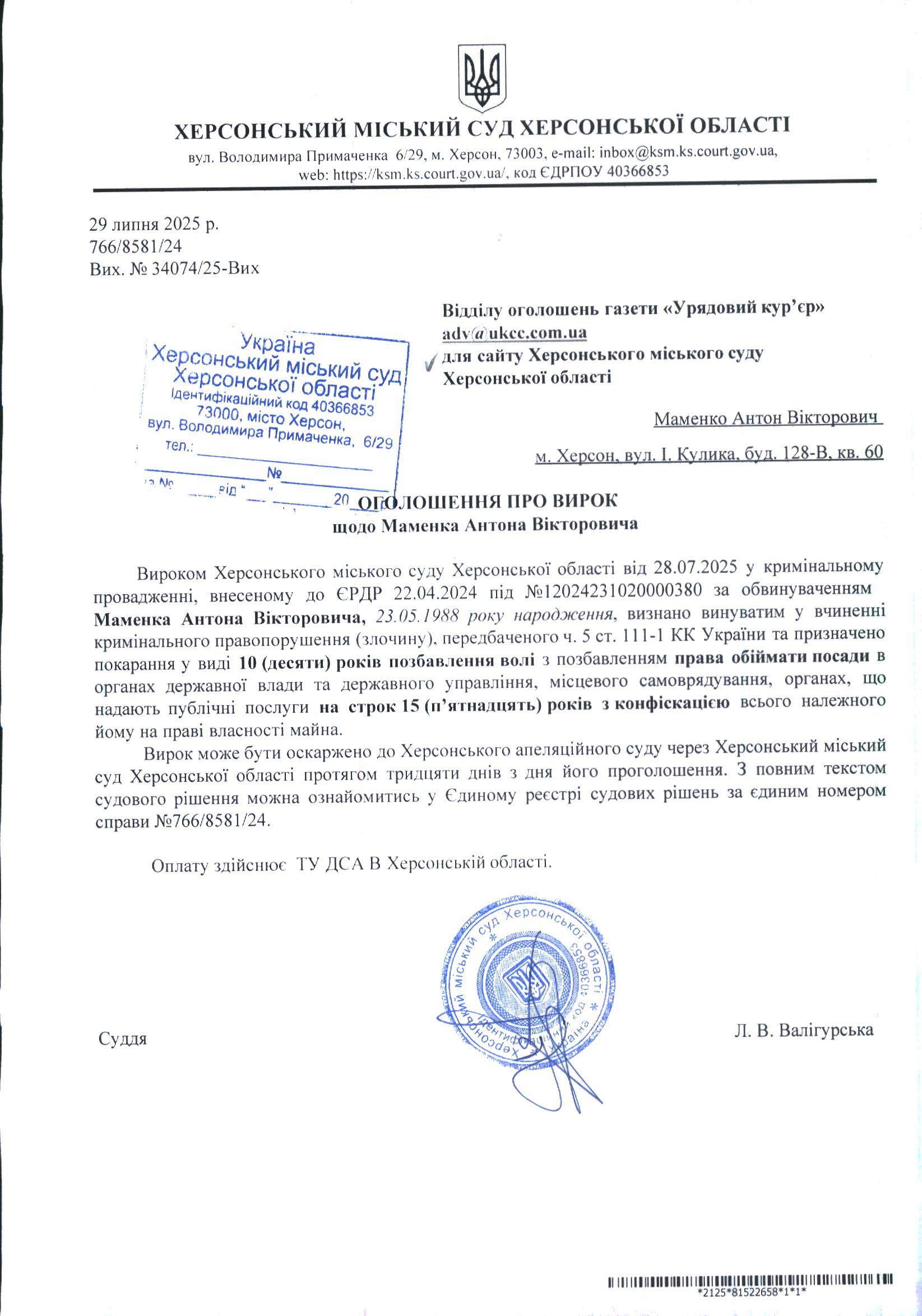 Оголошення для Маменка Антона Вікторовича про ухвалення вироку