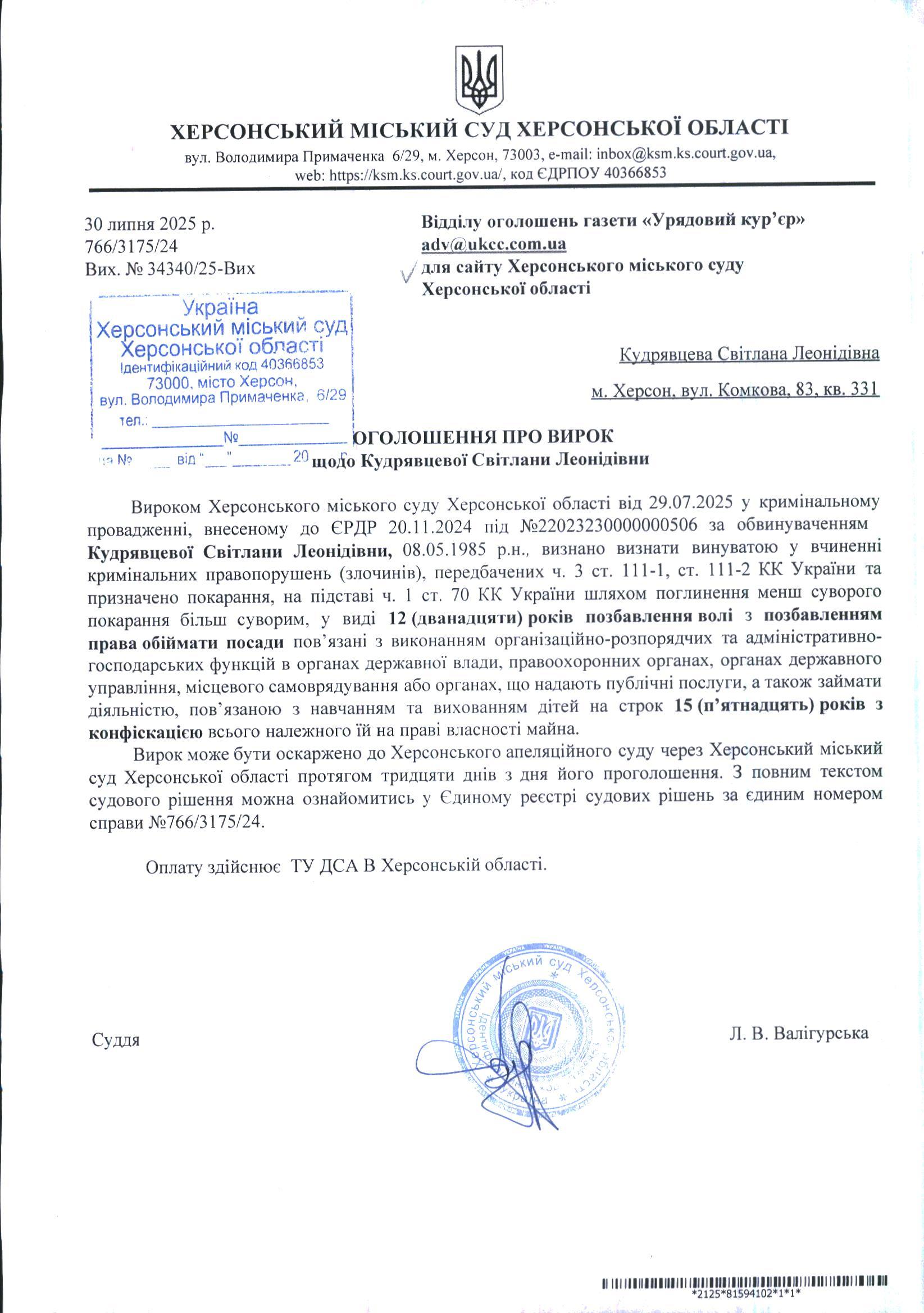 Оголошення для Кудрявцевої Світлани Леонідівни про ухвалення вироку