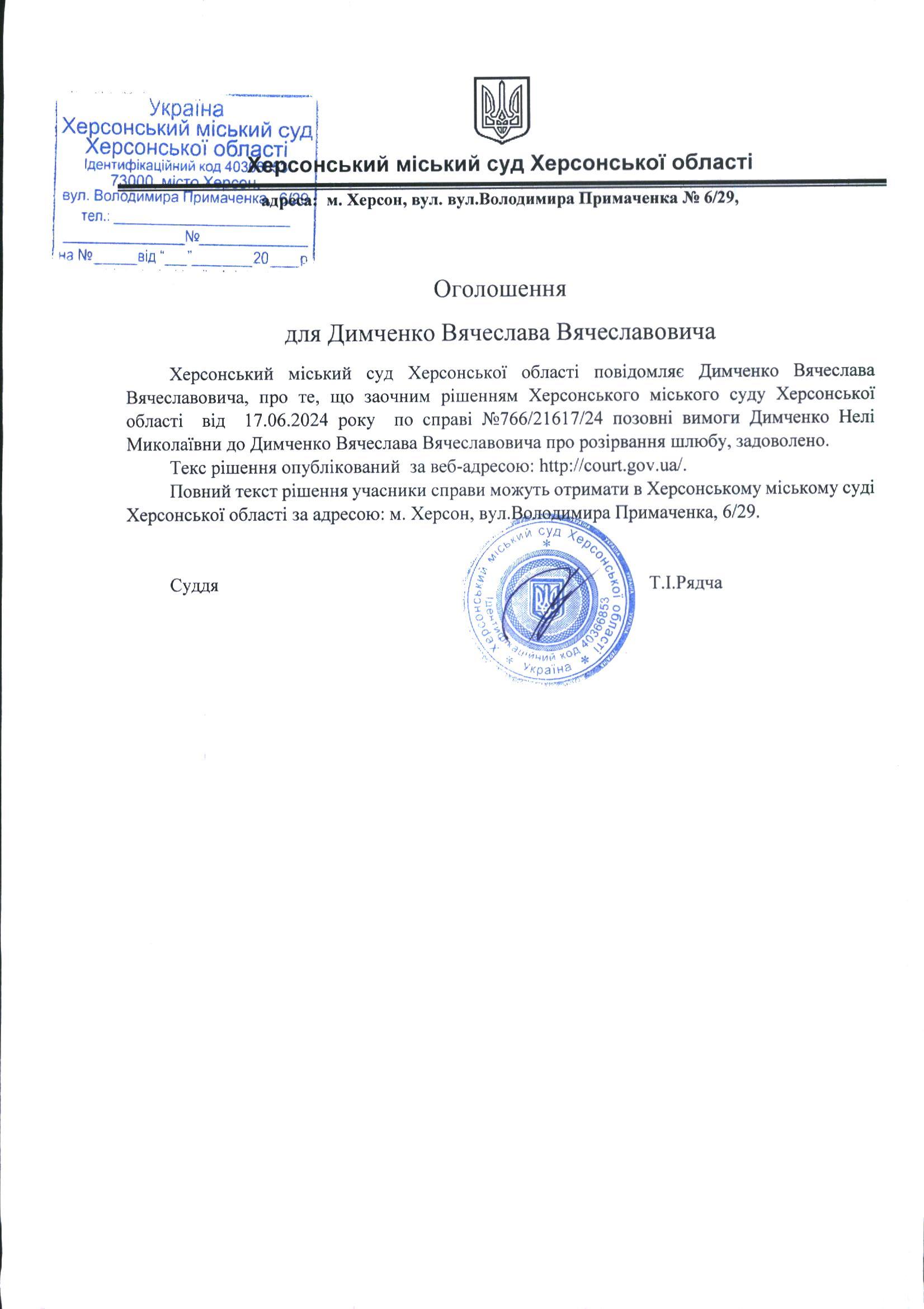 Оголошення для Димченко Вячеслава Вячеславовича про ухвалення заочного рішення