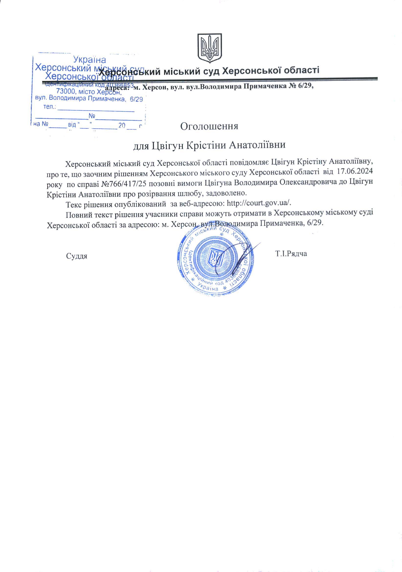 Оголошення для Цвігун Крістіни Анатоліївни про ухвалення заочного рішення