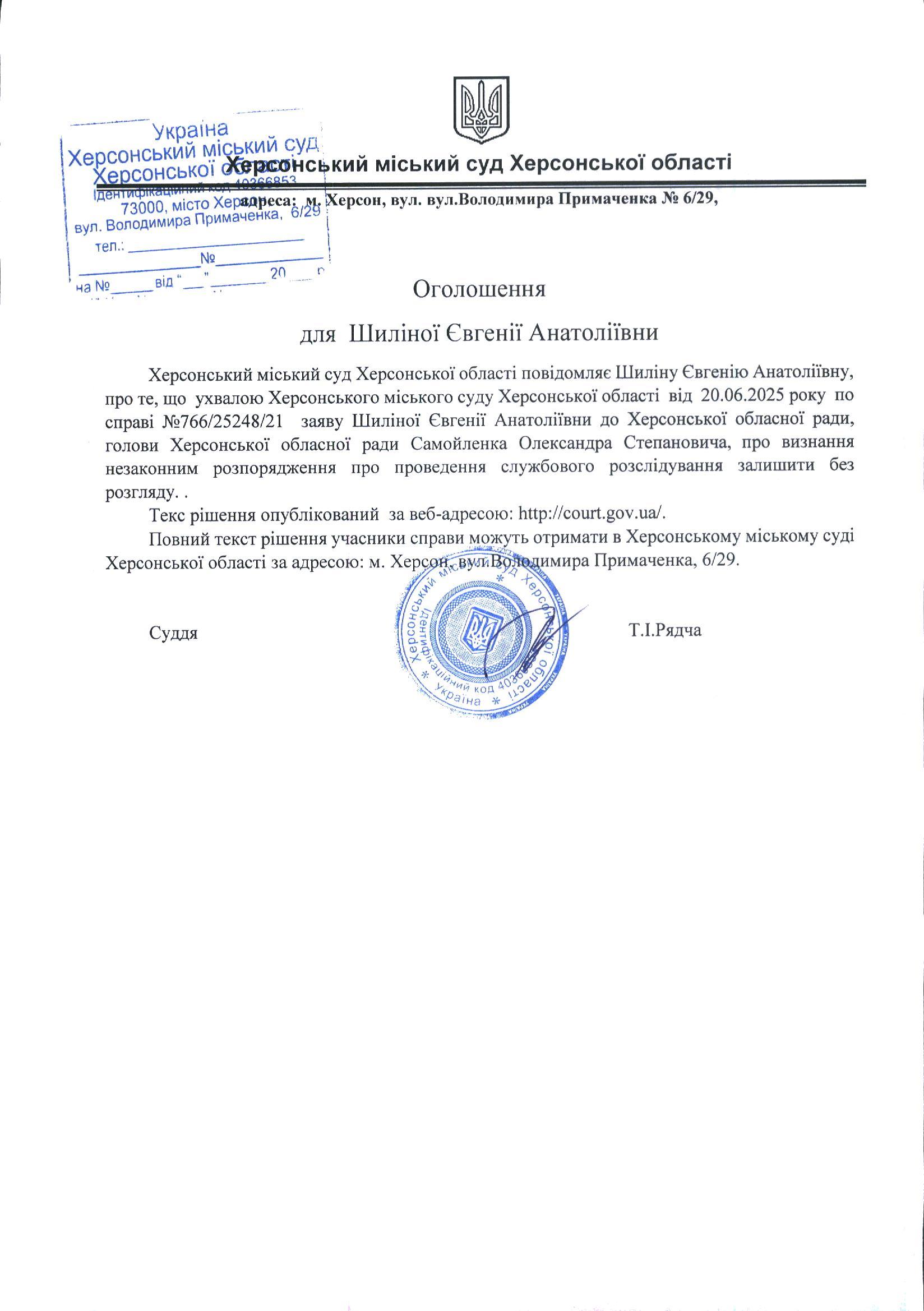 Оголошення для Шиліної Євгенії Анатоліївни про постановлення ухвали