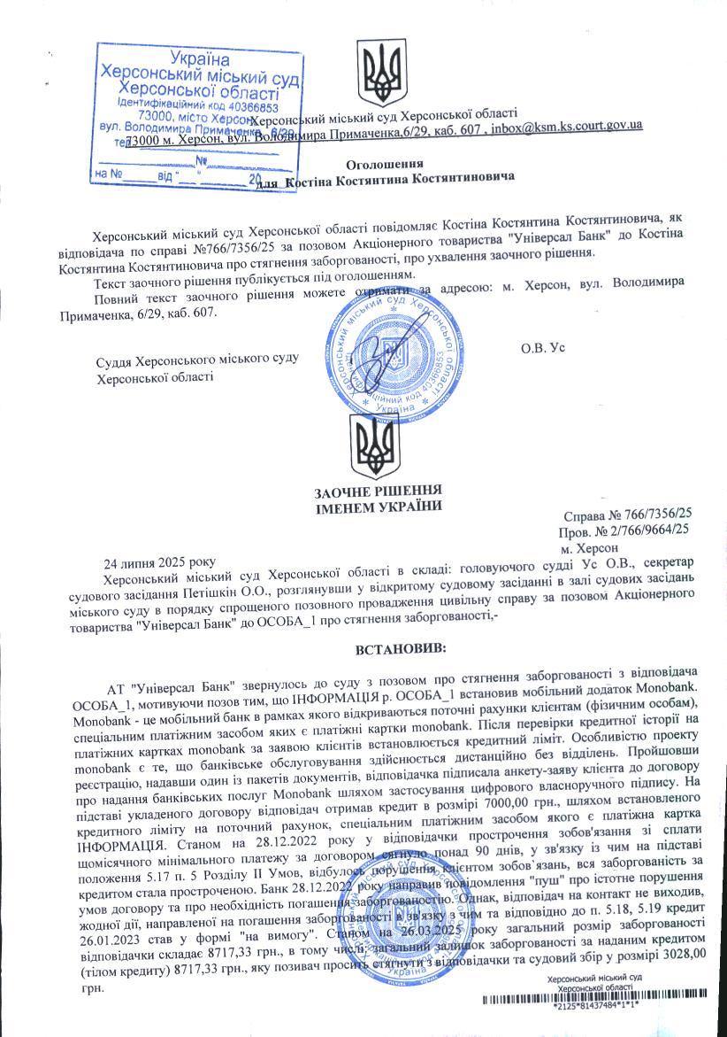Оголошення для Костіна Костянтина Костянтиновича про ухвалення заочного рішення