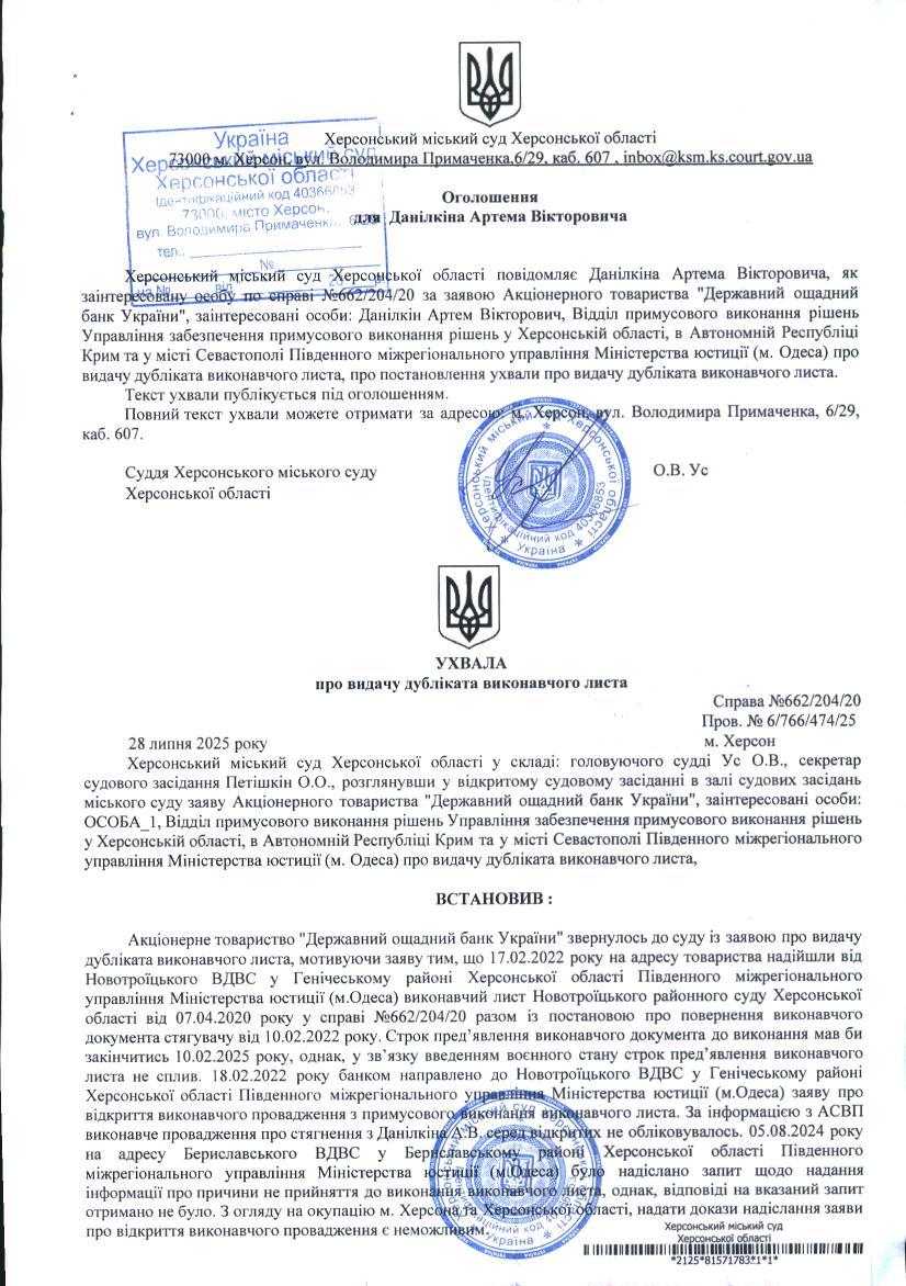 Оголошення для Данілкіна Артема Вікторовича про вилдачу дубліката виконавчого листа