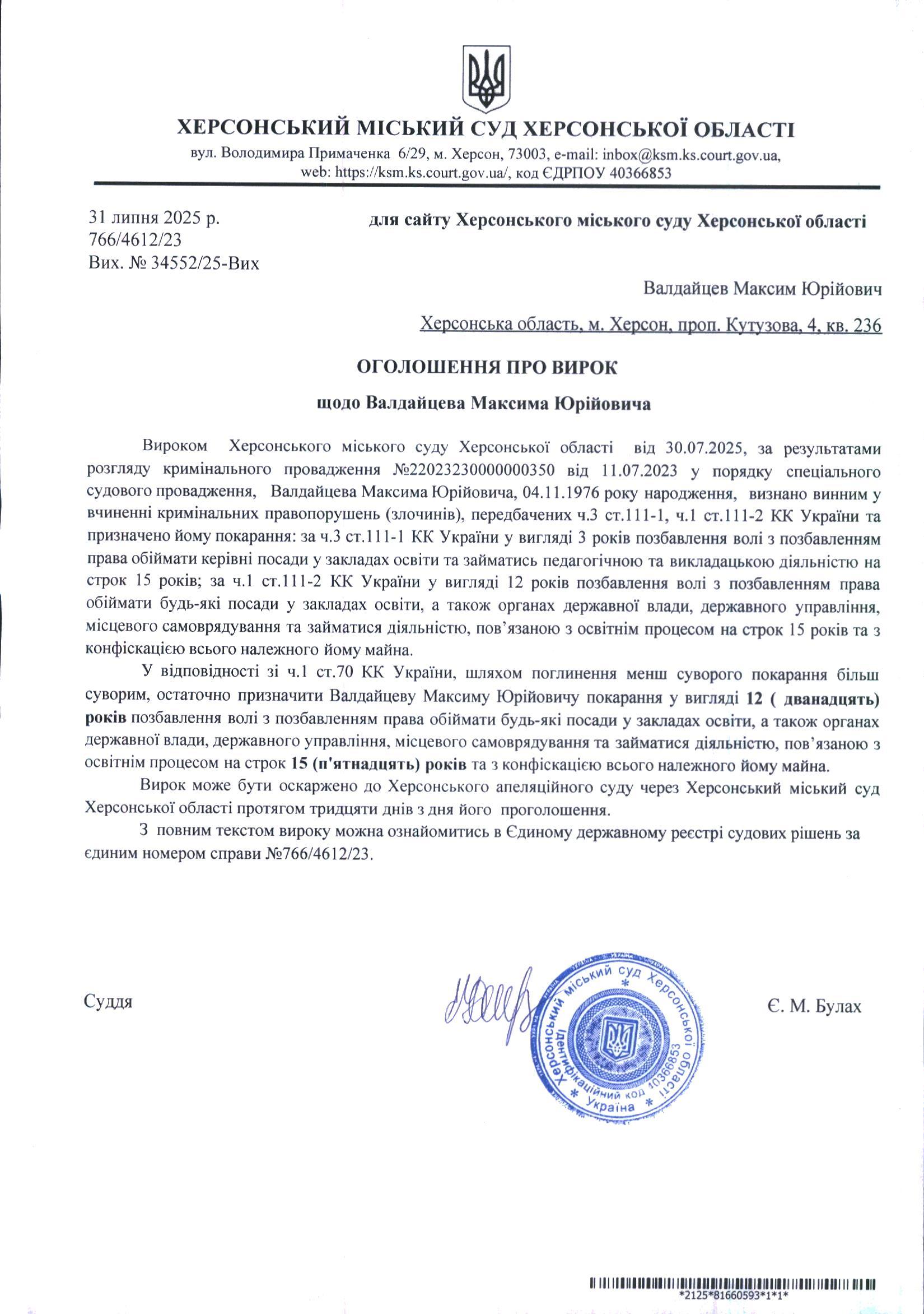 Оголошення для Валдайцева Максима Юрійовича про ухвалення вироку