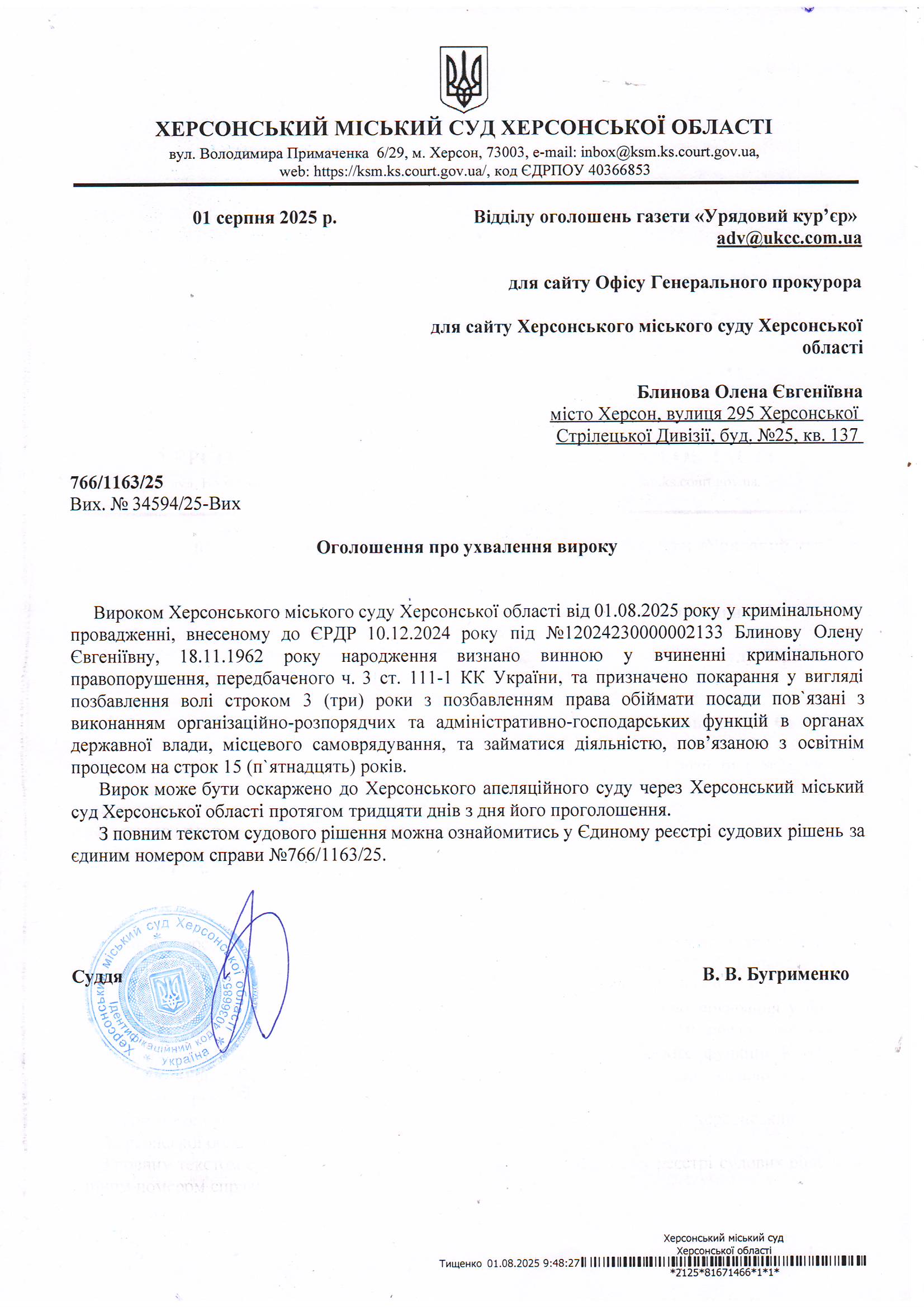 Оголошення для Блинової Олени Євгеніївни про ухвалення вироку