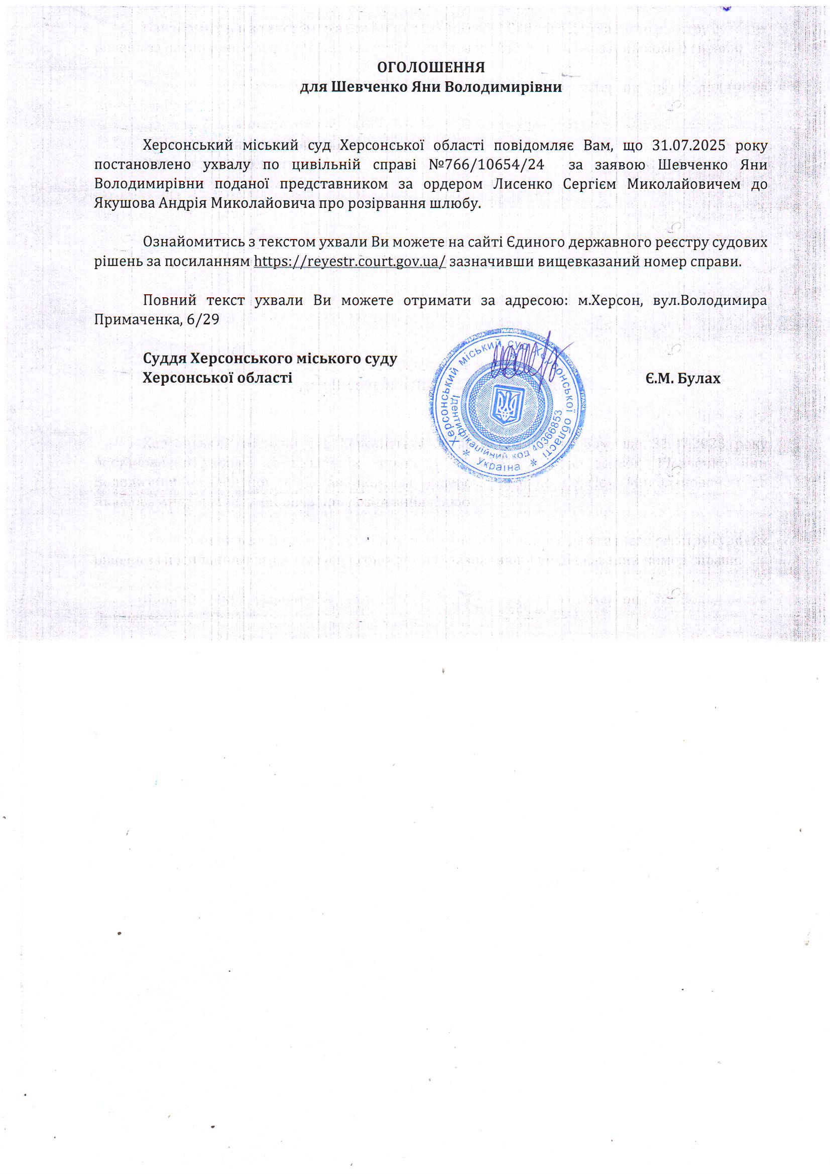 Оголошення для Шевченко Яни Володимирівни про постановлення ухвали