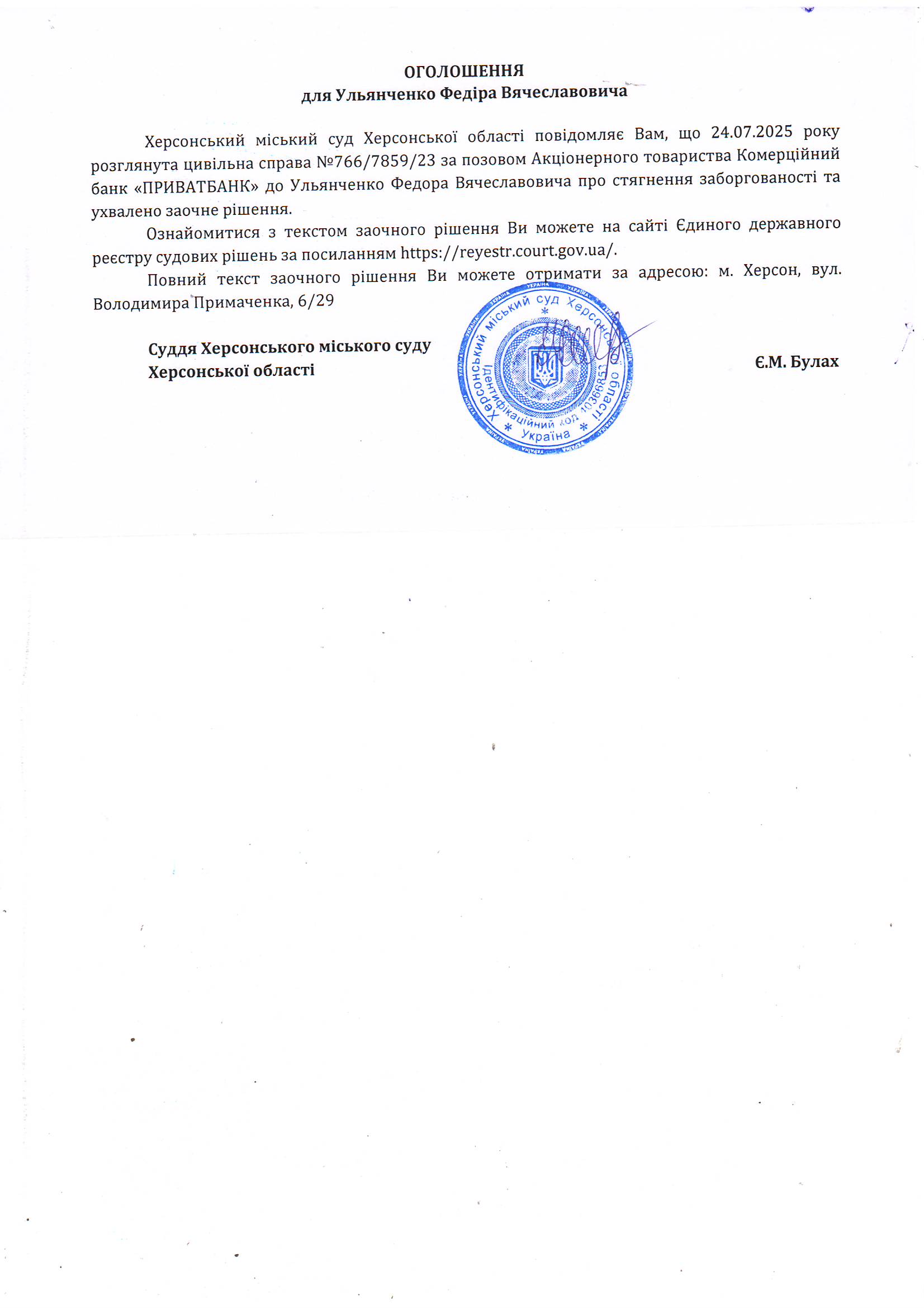 Оголошення для Ульянченка Федора Вячеславовича про ухвалення заочного рішення