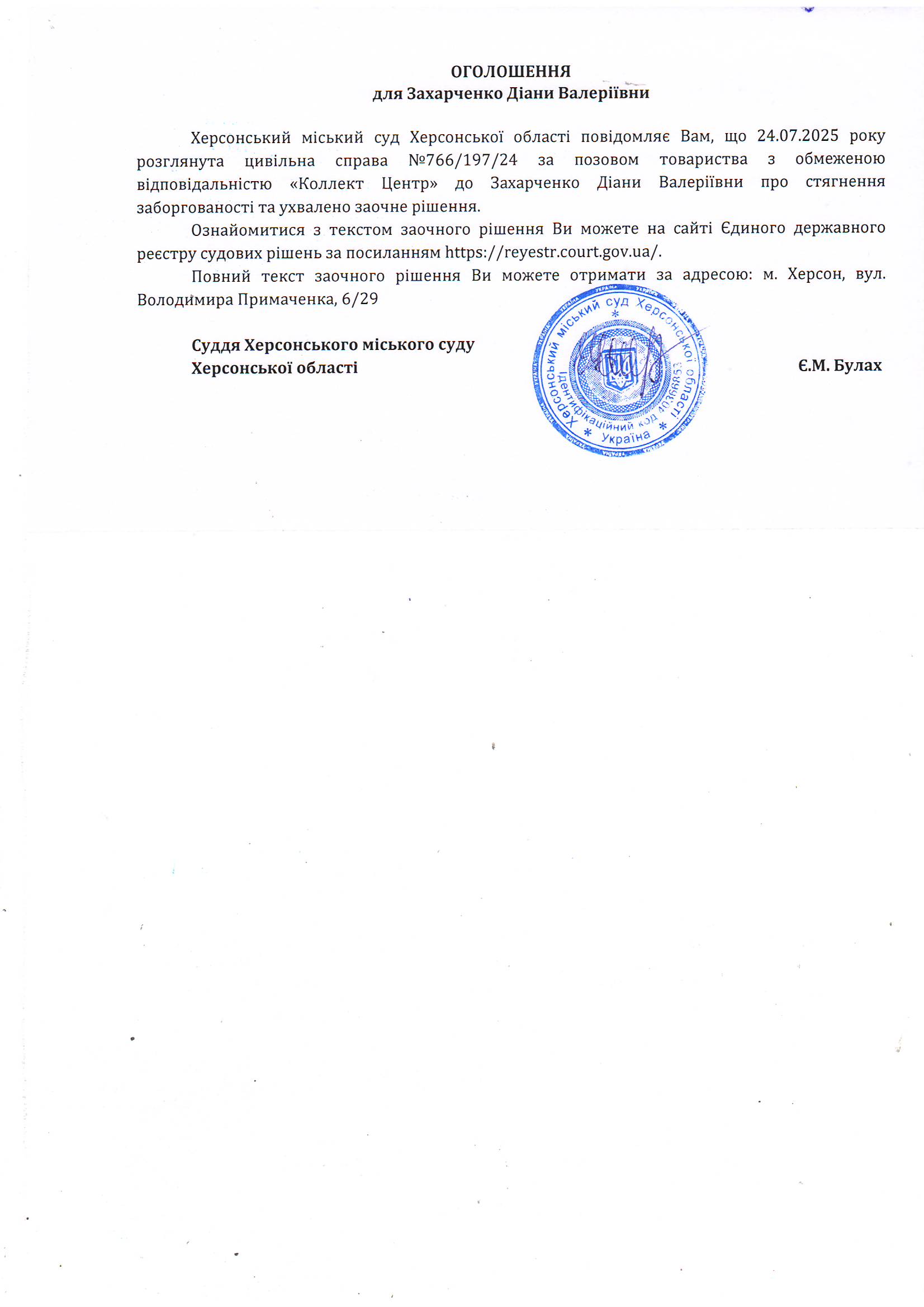 Оголошення для Захарченко Діани Валеріївни про ухвалення заочного рішення