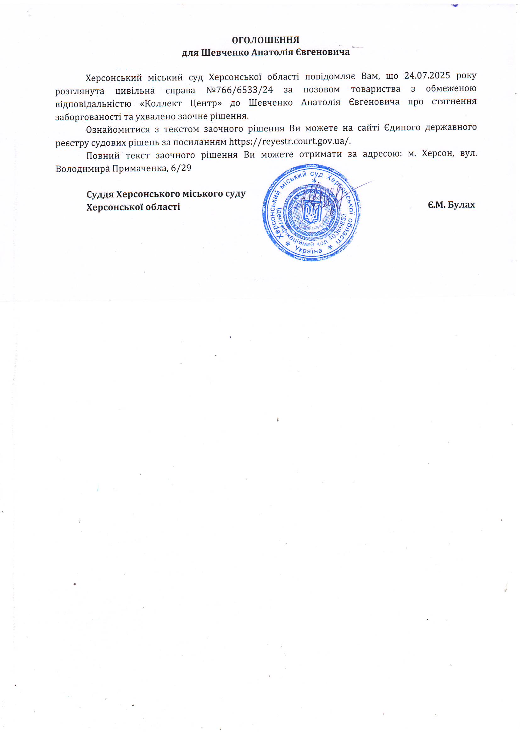 Оголошення для Шевченка Анатолія Євгеновича про ухвалення заочного рішення