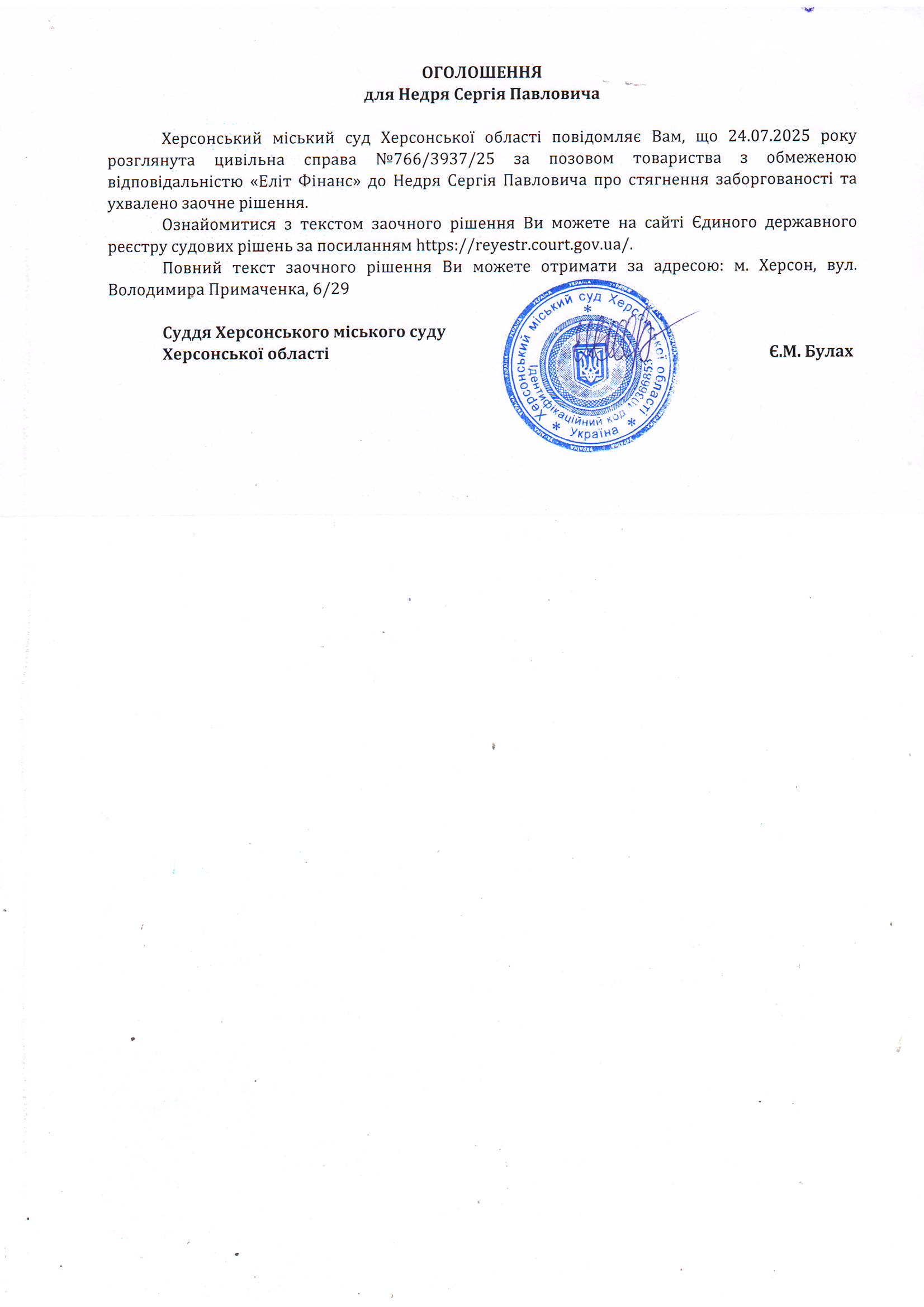 Оголошення для Недрі Сергія Павловича про ухвалення заочного рішення